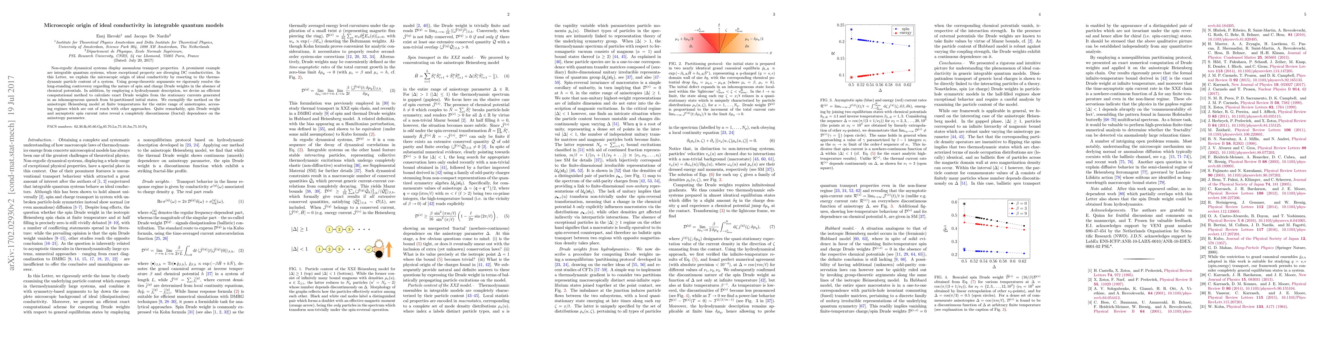 This paper elucidates the microscopic origin of ideal conductivity in integrable quantum models, resolving the nature of spin and charge Drude weights. It introduces a hydrodynamic method to compute exact Drude weights from stationary currents post-quench, exemplified on the anisotropic Heisenberg model, revealing fractal dependencies on anisotropy.