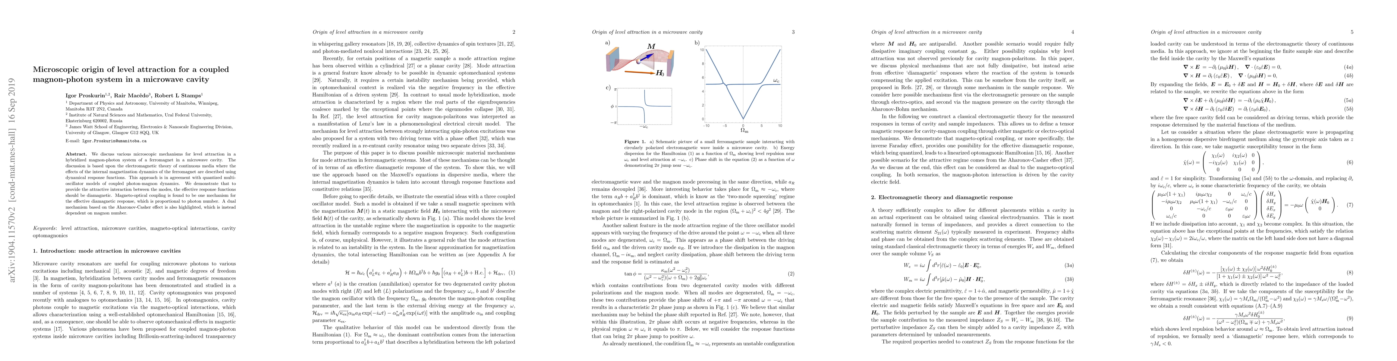 This paper explores microscopic mechanisms for level attraction in a hybridized magnon-photon system within a microwave cavity, emphasizing diamagnetic effective response functions. It identifies magneto-optical coupling and the Aharonov-Casher effect as dual mechanisms contributing to this attraction.