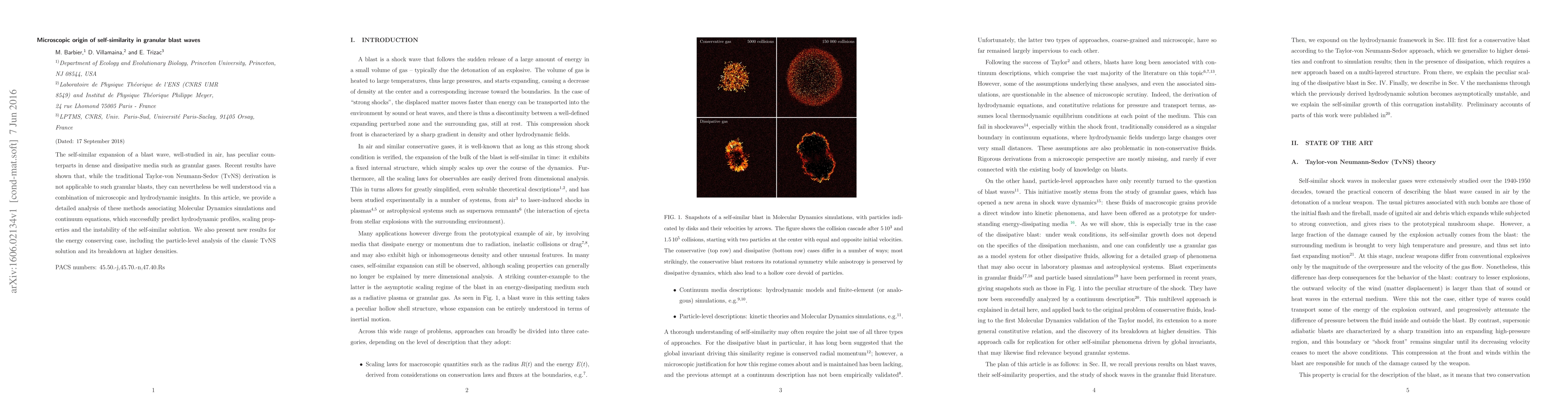 This paper investigates the microscopic origins of self-similarity in granular blast waves, demonstrating that traditional hydrodynamic models are insufficient. It combines Molecular Dynamics simulations with continuum equations to predict granular blast wave profiles and scaling properties, revealing the breakdown of the classic Taylor-von Neumann-Sedov solution at higher densities.