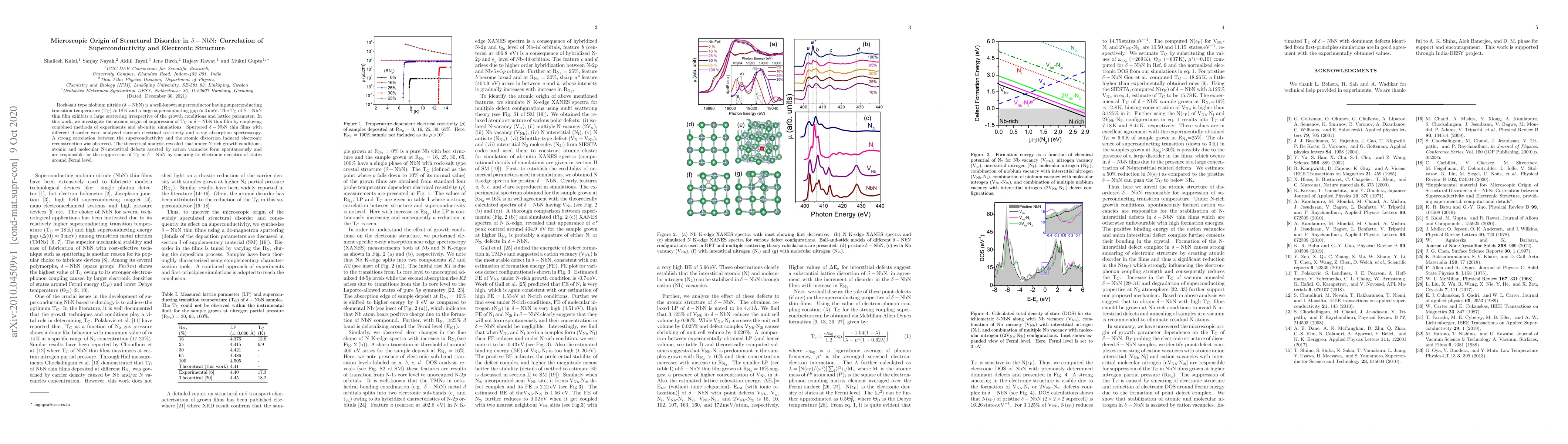 Rock-salt type niobium nitride ($\delta$-NbN) is a well-known superconductor having superconducting transition temperature (Tc) $\approx$ 18\,K and a large superconducting gap $\approx$3\,meV. The Tc of $\delta$-NbN thin film exhibits a large scattering irrespective of the growth conditions and lattice parameter. In this work, we investigate the atomic origin of suppression of Tc in $\delta$-NbN thin film by employing combined methods of experiments and ab-initio simulations. Sputtered $\delta$-NbN thin films with different disorder were analyzed through electrical resistivity and x-ray absorption spectroscopy. A strong correlation between the superconductivity and the atomic distortion induced electronic reconstruction was observed. The theoretical analysis revealed that under N-rich growth conditions, atomic and molecular N-interstitial defects assisted by cation vacancies form spontaneously and are responsible for the suppression of Tc in $\delta$-NbN by smearing its electronic densities of states around Fermi level.
