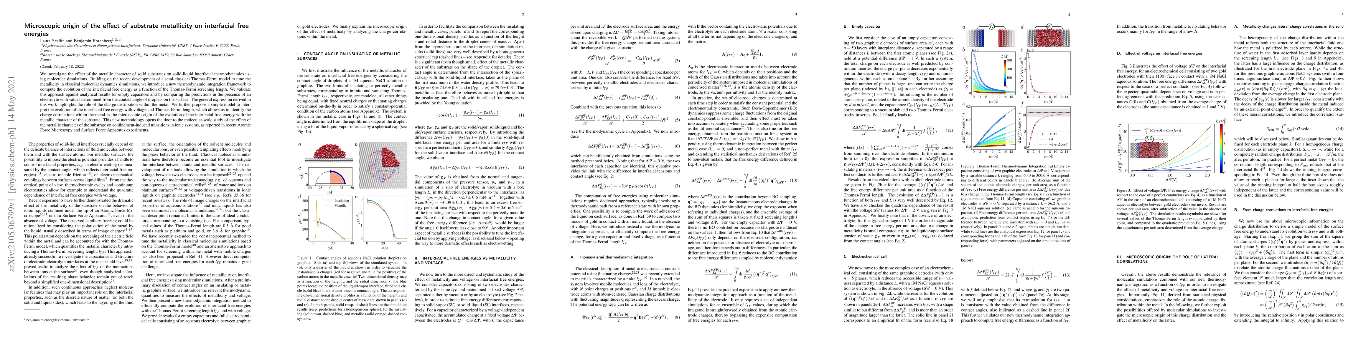 We investigate the effect of the metallic character of solid substrates on solid-liquid interfacial thermodynamics using molecular simulations. Building on the recent development of a semi-classical Thomas-Fermi model to tune the metallicity in classical molecular dynamics simulations, we introduce a new thermodynamic integration framework to compute the evolution of the interfacial free energy as a function of the Thomas-Fermi screening length. We validate this approach against analytical results for empty capacitors and by comparing the predictions in the presence of an electrolyte with values determined from the contact angle of droplets on the surface. The general expression derived in this work highlights the role of the charge distribution within the metal. We further propose a simple model to interpret the evolution of the interfacial free energy with voltage and Thomas-Fermi length, which allows us to identify the charge correlations within the metal as the microscopic origin of the evolution of the interfacial free energy with the metallic character of the substrate. This new methodology opens the door to the molecular-scale study of the effect of the metallic character of the substrate on confinement-induced transitions in ionic systems, as reported in recent Atomic Force Microscopy and Surface Force Apparatus experiments.