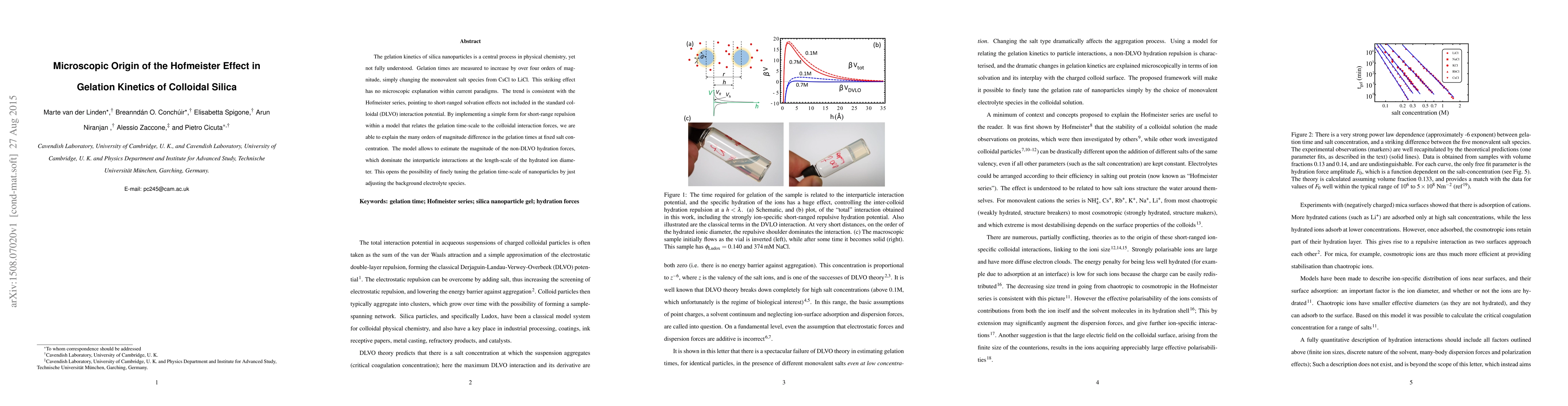 This research explains the significant variation in gelation times of silica nanoparticles, spanning over four orders of magnitude, when salt species change from CsCl to LiCl. The study proposes a model incorporating short-range repulsion within colloidal interaction force frameworks, attributing this drastic effect to non-DLVO hydration forces, and suggests the potential for precise control over gelation time scales via electrolyte species adjustment.