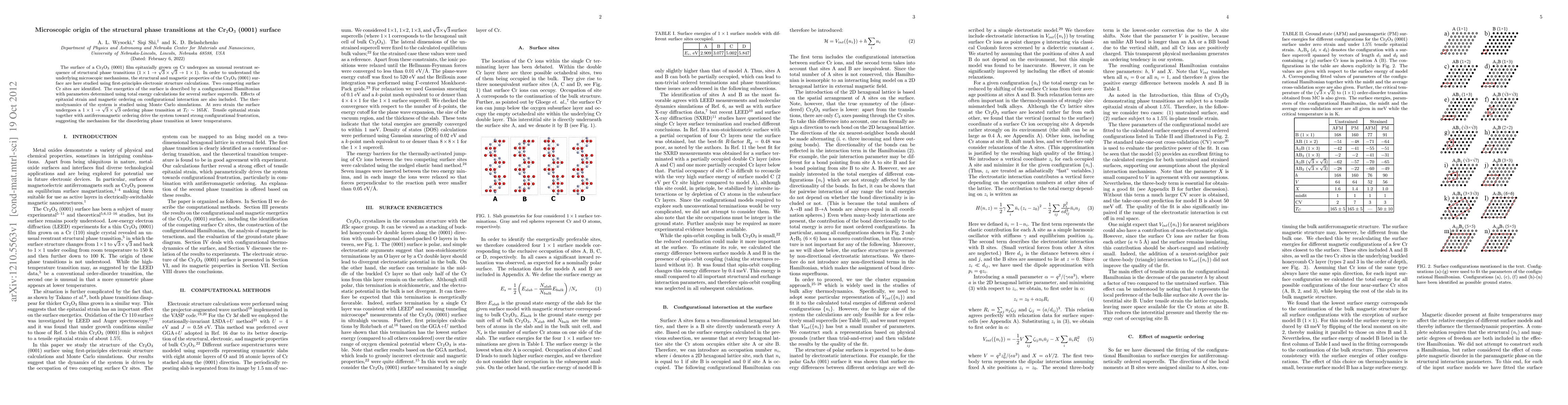 This paper investigates the microscopic origins of structural phase transitions at the Cr2O3 (0001) surface using first-principles calculations and Monte Carlo simulations. It identifies two competing Cr sites and explores how tensile strain and antiferromagnetic ordering lead to configurational frustration and disordering at lower temperatures.