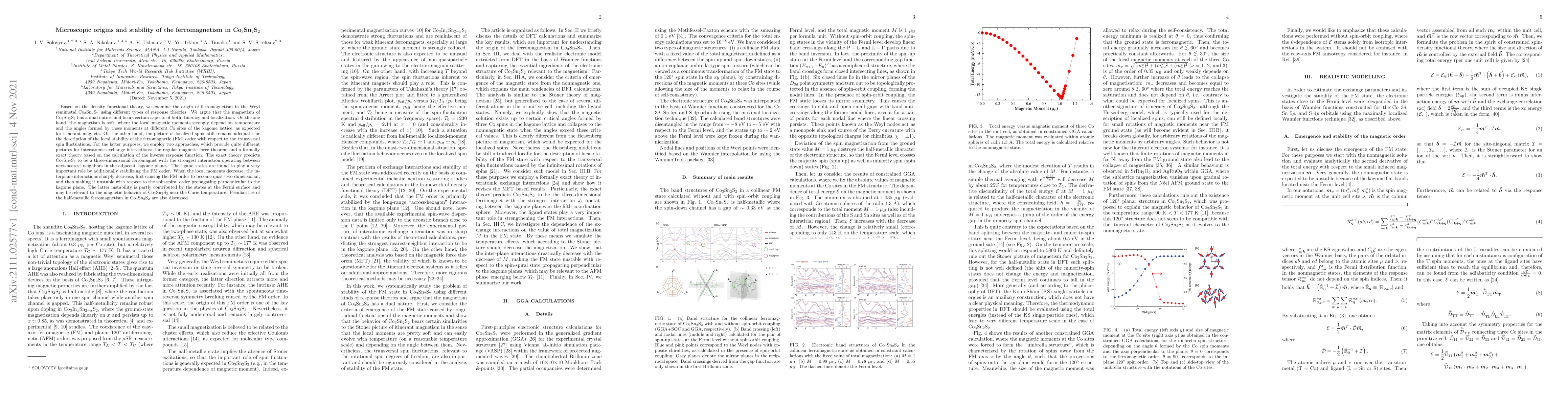 Based on the density functional theory, we examine the origin of ferromagnetism in the Weyl semimetal Co$_3$Sn$_2$S$_2$ using different types of response theories. We argue that the magnetism of Co$_3$Sn$_2$S$_2$ has a dual nature and bears certain aspects of both itineracy and localization. On the one hand, the magnetism is soft, where the local magnetic moments strongly depend on temperature and the angles formed by these moments at different Co sites of the kagome lattice, as expected for itinerant magnets. On the other hand, the picture of localized spins still remains adequate for the description of the local stability of the ferromagnetic (FM) order with respect to the transversal spin fluctuations. For the latter purposes, we employ two approaches, which provide quite different pictures for interatomic exchange interactions: the regular magnetic force theorem and a formally exact theory based on the calculation of the inverse response function. The exact theory predicts Co$_3$Sn$_2$S$_2$ to be a three-dimensional ferromagnet with the strongest interaction operating between next-nearest neighbors in the adjacent kagome planes. The ligand states are found to play a very important role by additionally stabilizing the FM order. When the local moments decrease, the interplane interactions sharply decrease, first causing the FM order to become quasi-two-dimensional, and then making it unstable with respect to the spin-spiral order propagating perpendicular to the kagome plane. The latter instability is partly contributed by the states at the Fermi surface and may be relevant to the magnetic behavior of Co$_3$Sn$_2$S$_2$ near the Curie temperature. Peculiarities of the half-metallic ferromagnetism in Co$_3$Sn$_2$S$_2$ are also discussed.