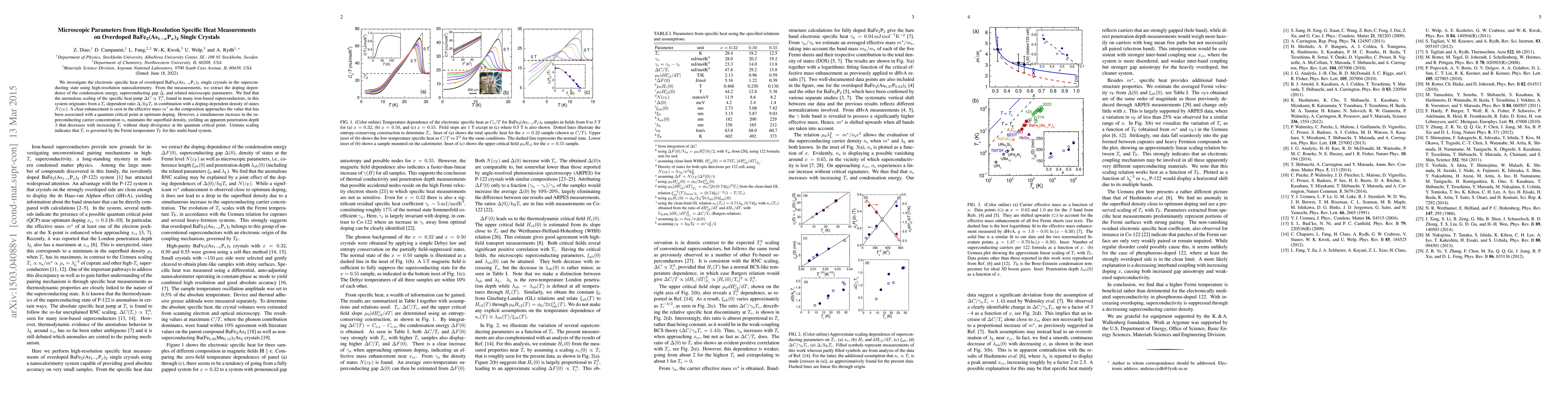 This study uses high-resolution specific heat measurements on overdoped BaFe2(As1-xPx)2 single crystals to determine microscopic parameters in the superconducting state. Key findings include an anomalous scaling of the specific heat jump due to a doping-dependent density of states and ratio of gap to Fermi temperature. The effective mass increases near a quantum critical point, but superfluid density remains high due to increased carrier concentration, with penetration depth decreasing as T_c increases without divergence at the critical point. Uemura scaling suggests T_c is tied to the Fermi temperature in this multi-band system.