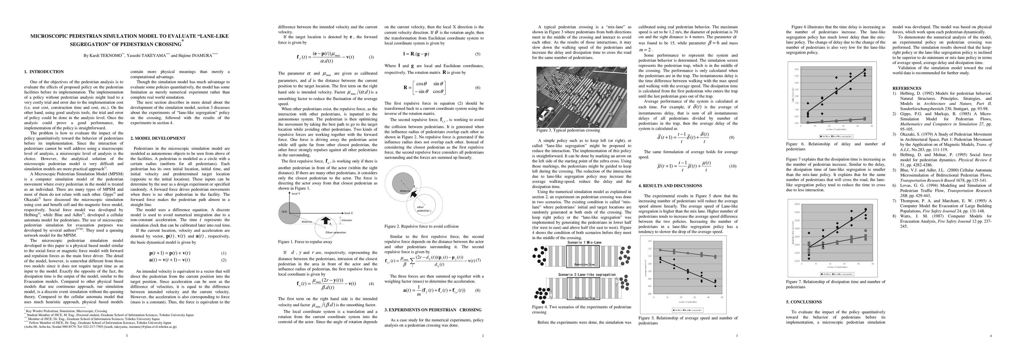 One of the objectives of the pedestrian analysis is to evaluate the effects of proposed policy on the pedestrian facilities before its implementation. The implementation of a policy without pedestrian analysis might lead to a very costly trial and error due to the implementation cost (i.e. user cost, construction time and cost, etc.). On the other hand, using good analysis tools, the trial and error of policy could be done in the analysis level. Once the analysis could prove a good performance, the implementation of the policy is straightforward. The problem is how to evaluate the impact of the policy quantitatively toward the behavior of pedestrians before its implementation. Since the interaction of pedestrians cannot be well address using a macroscopic level of analysis, a microscopic level of analysis is the choice. However, the analytical solution of the microscopic pedestrian model is very difficult and simulation models are more practical approach. To evaluate the impact of the policy quantitatively toward the behavior of pedestrians before its implementation, a microscopic pedestrian simulation model was developed. The model was based on physical forces, which work upon each pedestrian dynamically. To demonstrate the numerical analysis of the model, an experimental policy on pedestrian crossing was performed. The simulation results showed that the keep right policy or the lane-like segregation policy is inclined to be superior to do minimum or mix-lane policy in terms of average speed, average delay and dissipation time.