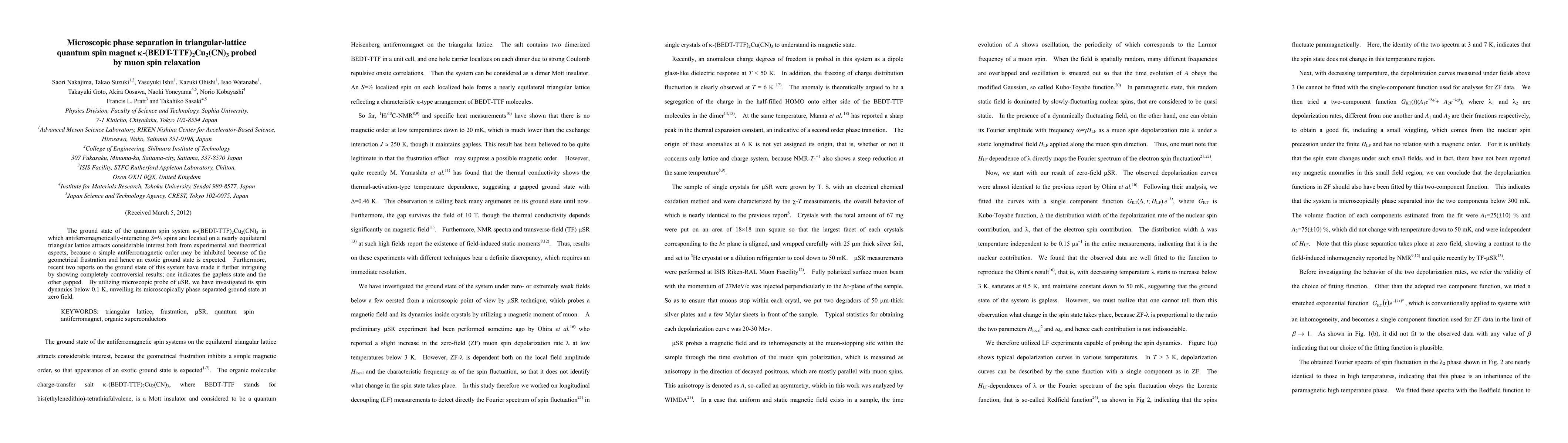 The ground state of the quantum spin system kappa-(BEDT-TTF)2Cu2(CN)3 in which antiferromagnetically-interacting S=1/2 spins are located on a nearly equilateral triangular lattice attracts considerable interest both from experimental and theoretical aspects, because a simple antiferromagnetic order may be inhibited because of the geometrical frustration and hence an exotic ground state is expected. Furthermore, recent two reports on the ground state of this system have made it further intriguing by showing completely controversial results; one indicates the gapless state and the other gapped. By utilizing microscopic probe of muSR, we have investigated its spin dynamics below 0.1 K, unveiling its microscopically phase separated ground state at zero field.