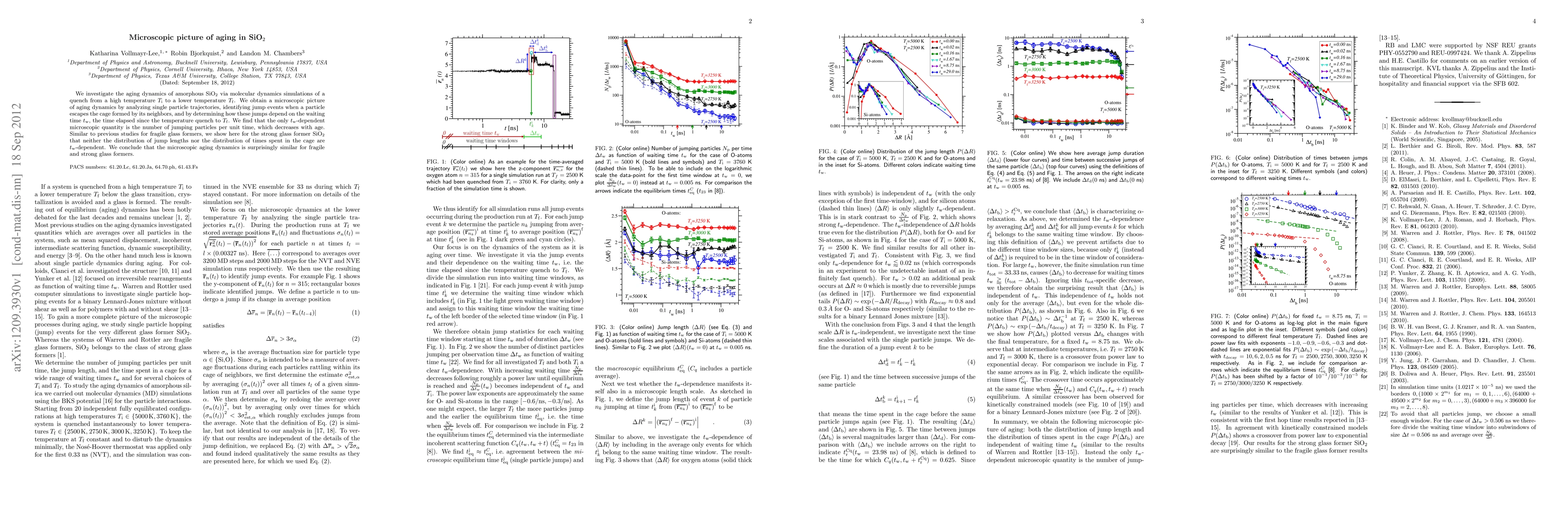 This study uses molecular dynamics simulations to examine the aging process in amorphous SiO2, a strong glass former. Key findings reveal that only the number of jumping particles per unit time decreases with age, while jump lengths and cage residence times remain constant, suggesting similar aging dynamics for fragile and strong glass formers.