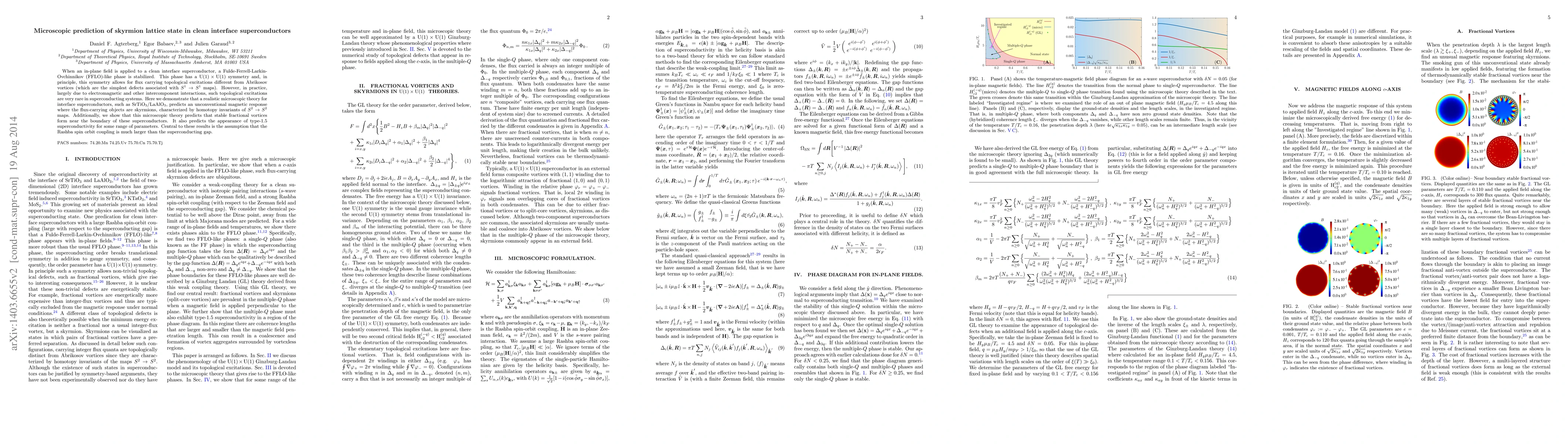 When an in-plane field is applied to a clean interface superconductor, a Fulde-Ferrell-Larkin-Ovchinnikov (FFLO)-like phase is stabilized. This phase has a $\mathrm{U}(1)\times\mathrm{U}(1)$ symmetry and, in principle, this symmetry allows for flux carrying topological excitations different from Abrikosov vortices (which are the simplest defects associated with $S^1 \to S^1$ maps). However, in practice, largely due to electromagnetic and other intercomponent interactions, such topological excitations are very rare in superconducting systems. Here we demonstrate that a realistic microscopic theory for interface superconductors, such as SrTiO$_3$/LaAlO$_3$, predicts an unconventional magnetic response where the flux-carrying objects are skyrmions, characterized by homotopy invariants of $S^2 \to S^2$ maps. Additionally, we show that this microscopic theory predicts that stable fractional vortices form near the boundary of these superconductors. It also predicts the appearance of type-1.5 superconductivity for some range of parameters. Central to these results is the assumption that the Rashba spin orbit coupling is much larger than the superconducting gap.