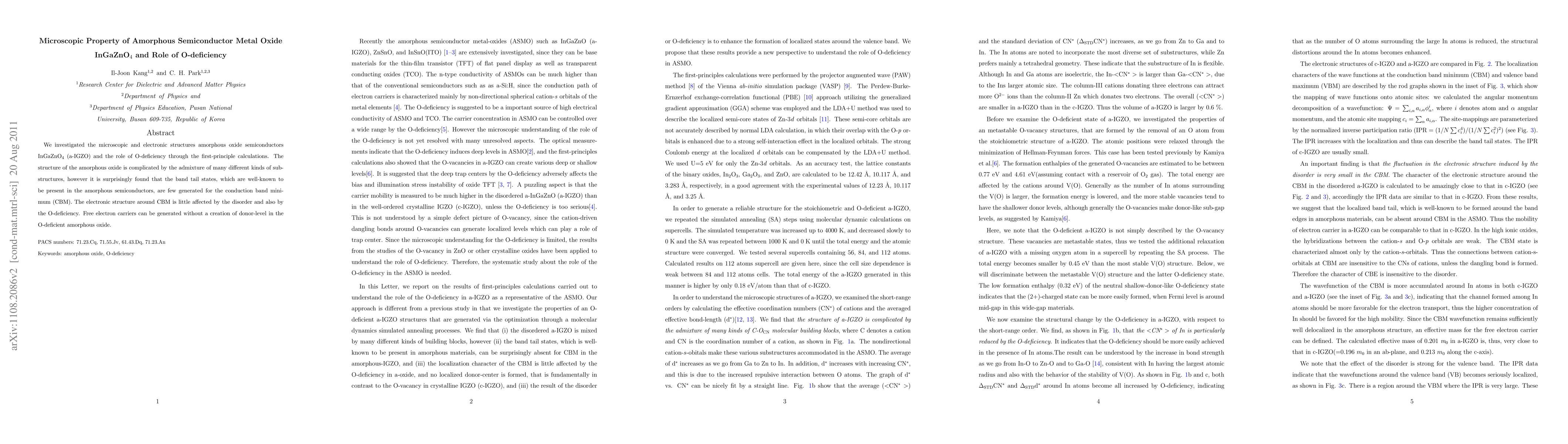We investigated the microscopic and electronic structures amorphous oxide semiconductors InGaZnO$_{4}$ (a-IGZO) and the role of O-deficiency through the first-principle calculations. The structure of the amorphous oxide is complicated by the admixture of many different kinds of substructures, however it is surprisingly found that the band tail states, which are well-known to be present in the amorphous semiconductors, are few generated for the conduction band minimum (CBM). The electronic structure around CBM is little affected by the disorder and also by the O-deficiency. Free electron carriers can be generated without a creation of donor-level in the O-deficient amorphous oxide.