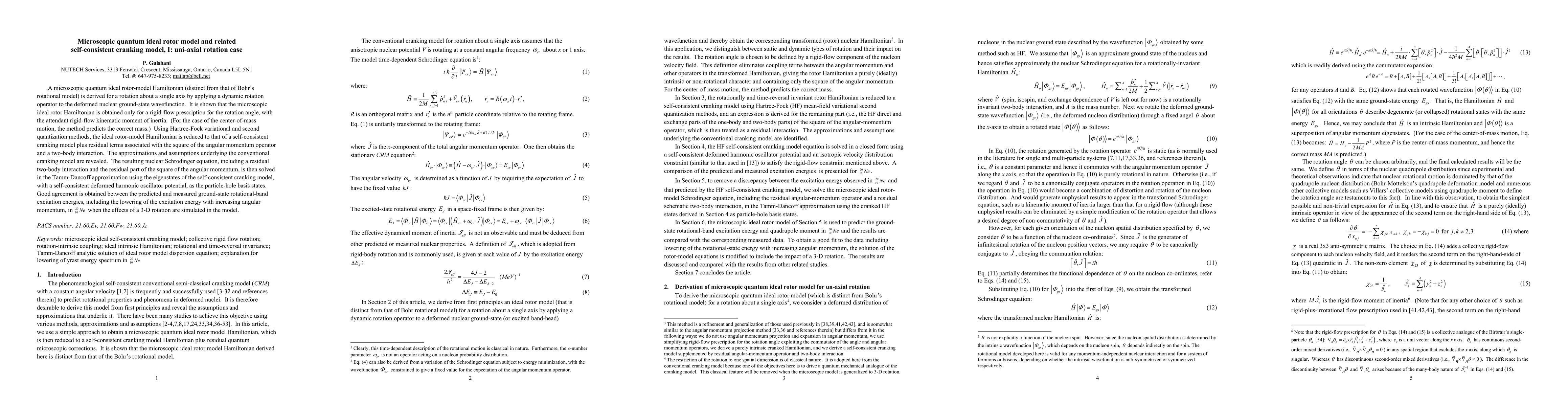 This paper derives a microscopic quantum ideal rotor-model Hamiltonian for uni-axial nuclear rotation, showing it aligns with a rigid-flow prescription. It then reduces this model to a self-consistent cranking model, revealing underlying approximations, and solves the resulting Schrödinger equation to predict ground-state rotational-band excitation energies, achieving good agreement with experimental data for Ne-20.
