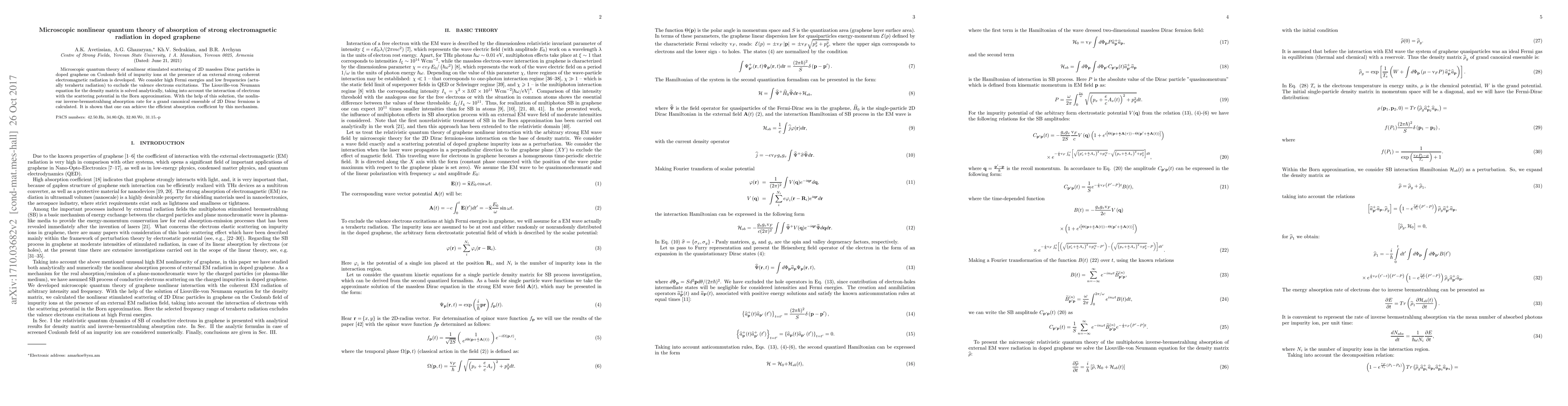 This paper develops a microscopic quantum theory for nonlinear absorption in doped graphene under strong electromagnetic radiation, focusing on terahertz frequencies. The analytical solution of the Liouville-von Neumann equation reveals an efficient absorption coefficient via nonlinear inverse-bremsstrahlung, facilitated by the interaction of 2D Dirac fermions with impurity ions.