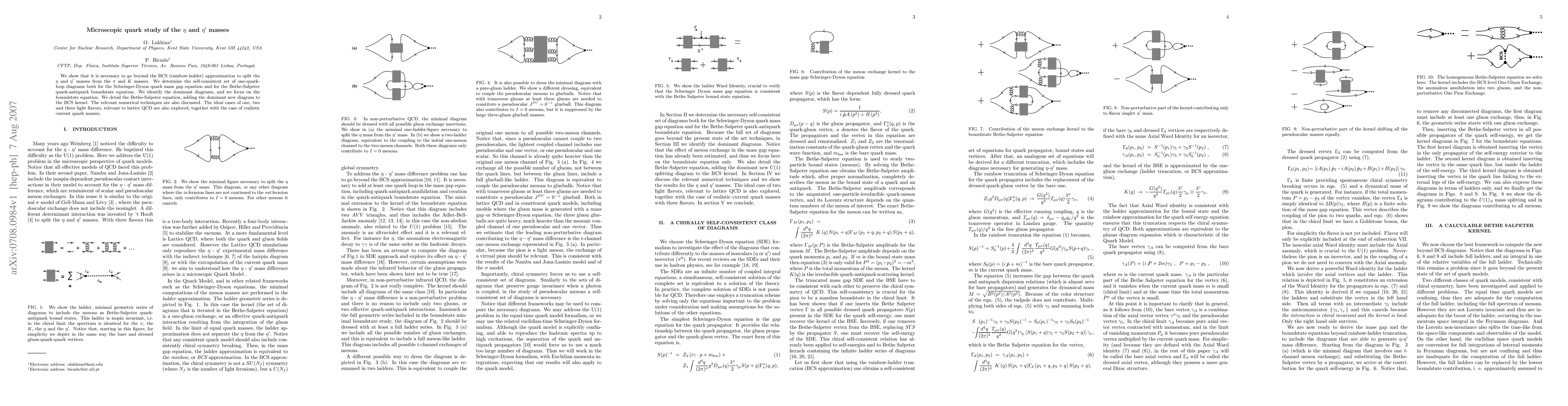 We show that it is necessary to go beyond the BCS (rainbow-ladder) approximation to split the $\eta$ and $\eta'$ masses from the $\pi$ and K masses. We determine the self-consistent set of one-quark-loop diagrams both for the Schwinger-Dyson quark mass gap equation and for the Bethe-Salpeter quark-antiquark boundstate equation. We identify the dominant diagrams, and we focus on the boundstate equation. We detail the Bethe-Salpeter equation, adding the dominant new diagram to the BCS kernel. The relevant numerical techniques are also discussed. The ideal cases of one, two and three light flavors, relevant to lattice QCD are also explored, together with the case of realistic current quark masses.