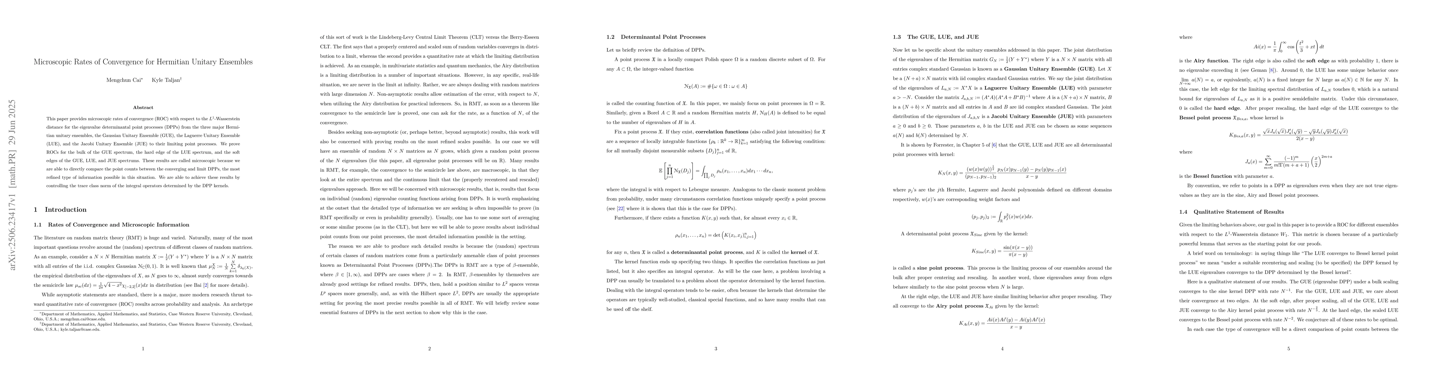This paper provides microscopic rates of convergence (ROC) with respect to the $L^1$-Wasserstein distance for the eigenvalue determinantal point processes (DPPs) from the three major Hermitian unitary ensembles, the Gaussian Unitary Ensemble (GUE), the Laguerre Unitary Ensemble (LUE), and the Jacobi Unitary Ensemble (JUE) to their limiting point processes. We prove ROCs for the bulk of the GUE spectrum, the hard edge of the LUE spectrum, and the soft edges of the GUE, LUE, and JUE spectrums. These results are called microscopic because we are able to directly compare the point counts between the converging and limit DPPs, the most refined type of information possible in this situation. We are able to achieve these results by controlling the trace class norm of the integral operators determined by the DPP kernels.