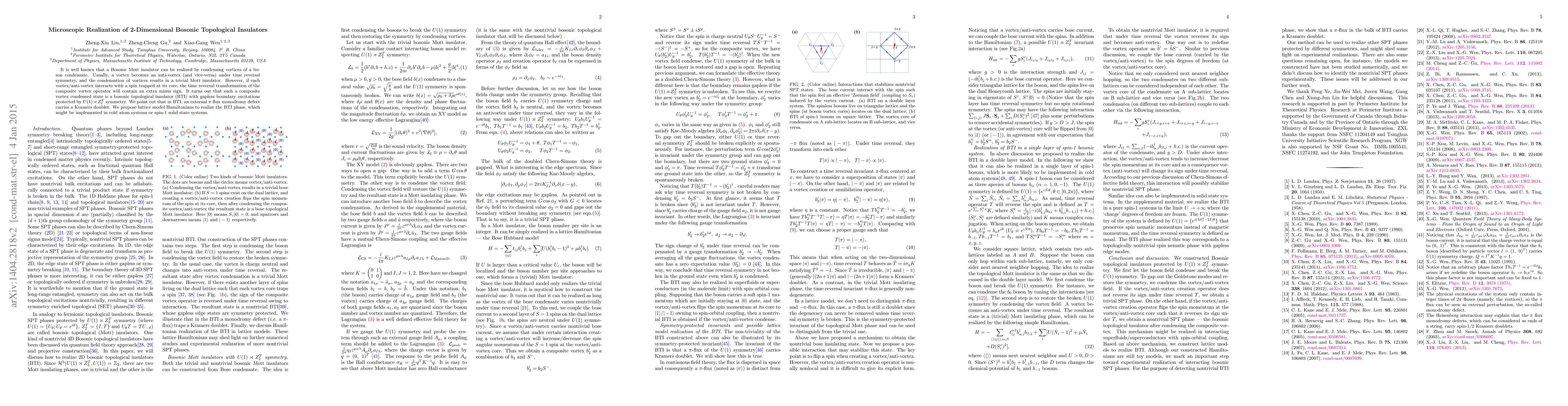 It is well known that a Bosonic Mott insulator can be realized by condensing vortices of a bo- son condensate. Usually, a vortex becomes an anti-vortex (and vice-versa) under time reversal symmetry, and the condensation of vortices results in a trivial Mott insulator. However, if each vortex or anti-vortex interacts with a spin trapped at its core, the time reversal transformation of the composite vortex operator will contain an extra minus sign. It turns out that such a composite vortex condensed state is a bosonic topological insulator (BTI) with gapless boundary excitations protected by $U(1)\rtimes Z_2^T$ symmetry. We point out that in BTI, an external $\pi$ flux monodromy defect carries a Kramers doublet. We propose lattice model Hamiltonians to realize the BTI phase, which might be implemented in cold atom systems or spin-1 solid state systems.