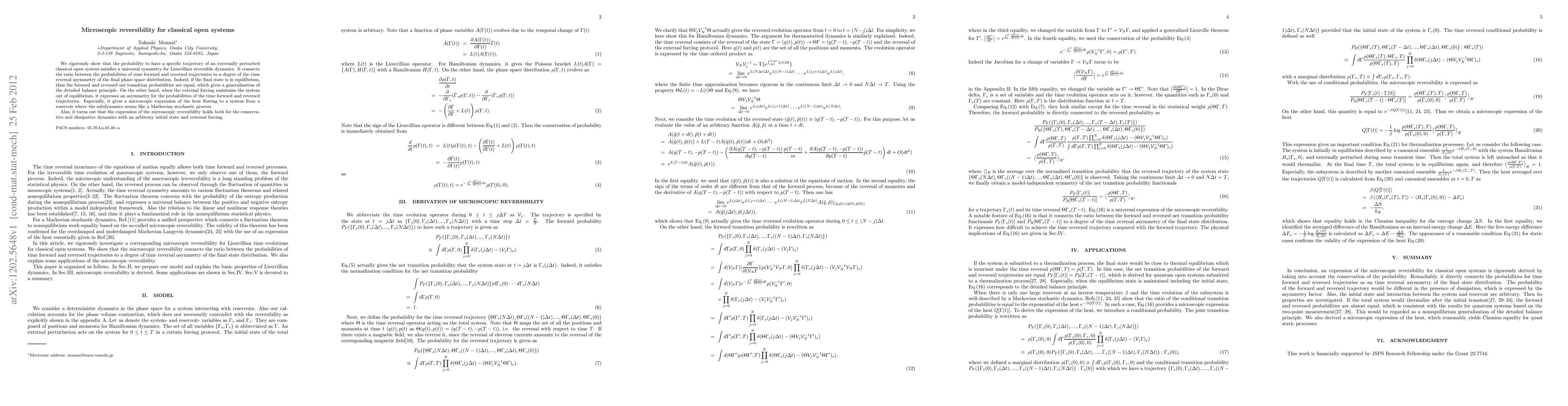 This paper demonstrates microscopic reversibility for classical open systems, showing that trajectory probabilities exhibit a universal symmetry for Liouvillian reversible dynamics. It generalizes the detailed balance principle, revealing time-reversal asymmetry in non-equilibrium states and providing a microscopic expression for heat flow from reservoirs.