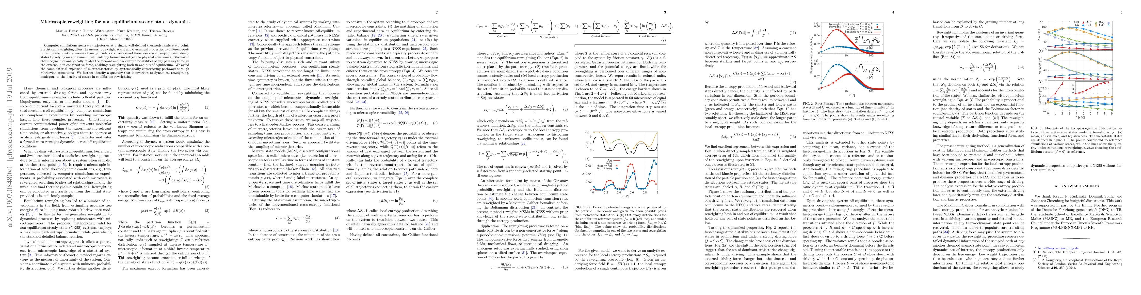 This paper proposes a method for reweighting computer simulation data to study non-equilibrium steady states using maximum path entropy and stochastic thermodynamics. It avoids the combinatorial complexity of microtrajectories by constructing pathways through Markovian transitions and identifies an invariant quantity akin to the density of states in equilibrium.