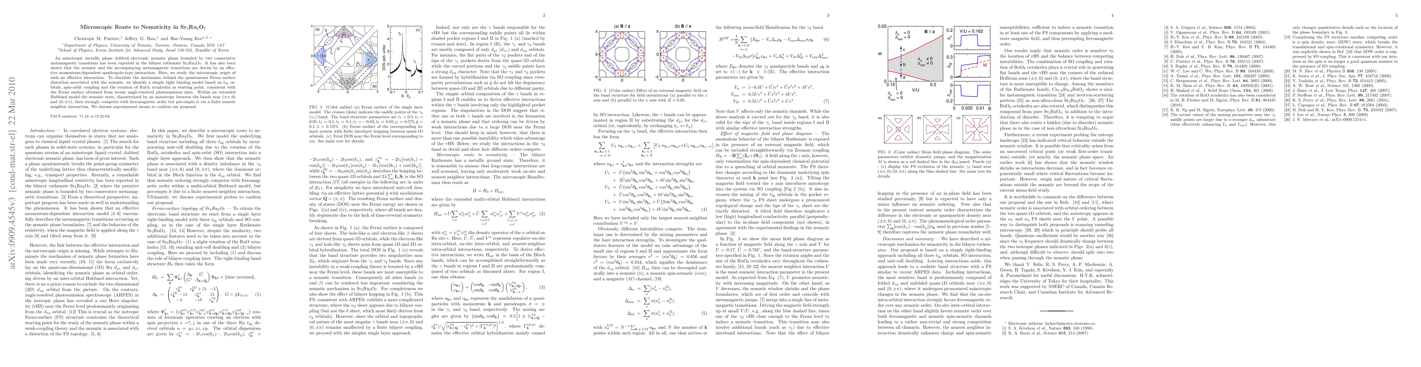 An anisotropic metallic phase dubbed electronic nematic phase bounded by two consecutive metamagnetic transitions has been reported in the bilayer ruthenate Sr3Ru2O7. It has also been shown that the nematic and the accompanying metamagnetic transitions are driven by an effective momentum-dependent quadrupole-type interaction. Here, we study the microscopic origin of such an effective interaction. To elucidate the mechanism behind the spontaneous Fermi surface distortion associated with the nematic, we identify a simple tight binding model based on t2g orbitals, spin-orbit coupling and the rotation of RuO6 octahedra as starting point, consistent with the Fermi surface obtained from recent angle-resolved photoemission data. Within an extended Hubbard model the nematic state, characterized by an anisotropy between the bands near $(\pm \pi,0)$ and $(0,\pm \pi)$, then strongly competes with ferromagnetic order but pre-empts it via a finite nearest neighbor interaction. We discuss experimental means to confirm our proposal.