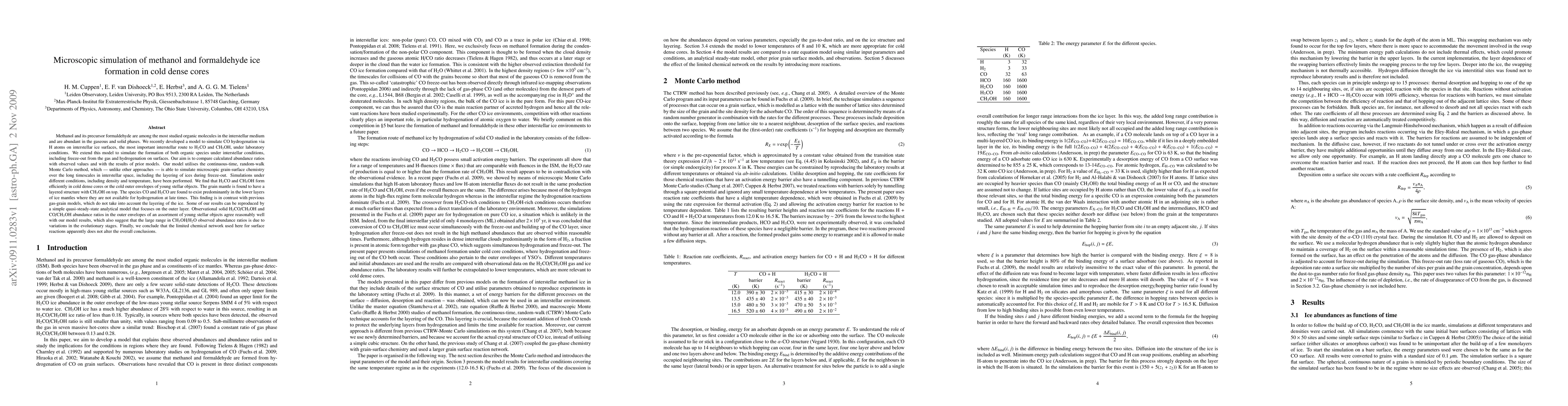 This research simulates the formation of methanol and formaldehyde ice in cold dense cores, finding efficient production via hydrogenation on interstellar ice surfaces. The study reveals layered grain mantles with methanol on top, while CO and H2CO reside in lower layers, unavailable for late-stage hydrogenation.