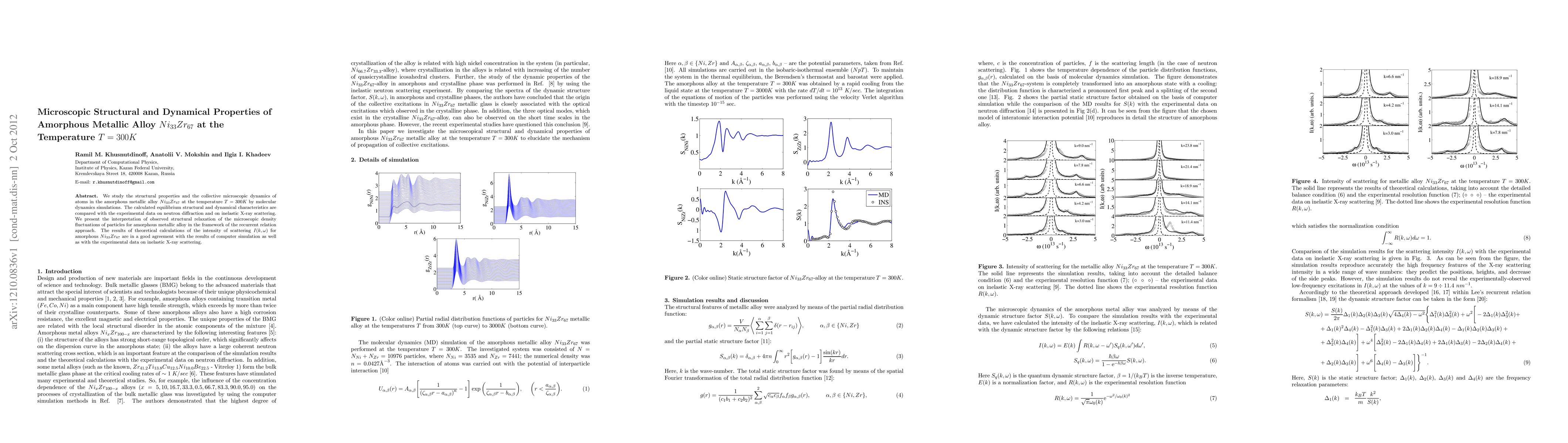 We study the structural properties and the collective microscopic dynamics of atoms in the amorphous metallic alloy $Ni_{33}Zr_{67}$ at the temperature $T=300K$ by molecular dynamics simulations. The calculated equilibrium structural and dynamical characteristics are compared with the experimental data on neutron diffraction and on inelastic X-ray scattering. We present the interpretation of observed structural relaxation of the microscopic density fluctuations of particles for amorphous metallic alloy in the framework of the recurrent relation approach. The results of theoretical calculations of the intensity of scattering $I(k,\omega)$ for amorphous $Ni_{33}Zr_{67}$ are in a good agreement with the results of computer simulation as well as with the experimental data on inelastic X-ray scattering.