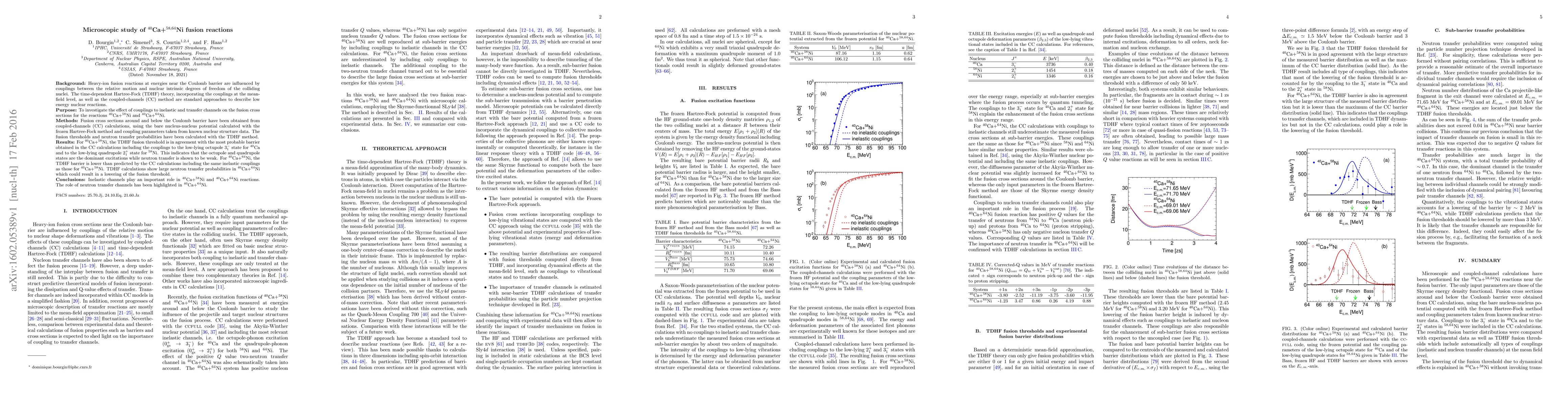 Background: Heavy-ion fusion reactions at energies near the Coulomb barrier are influenced by couplings between the relative motion and nuclear intrinsic degrees of freedom of the colliding nuclei. The time-dependent Hartree-Fock (TDHF) theory, incorporating the couplings at the mean-field level, as well as the coupled-channels (CC) method are standard approaches to describe low energy nuclear reactions. Purpose: To investigate the effect of couplings to inelastic and transfer channels on the fusion cross sections for the reactions $^{40}$Ca+$^{58}$Ni and $^{40}$Ca+$^{64}$Ni. Methods: Fusion cross sections around and below the Coulomb barrier have been obtained from coupled-channels (CC) calculations, using the bare nucleus-nucleus potential calculated with the frozen Hartree-Fock method and coupling parameters taken from known nuclear structure data. The fusion thresholds and neutron transfer probabilities have been calculated with the TDHF method. Results: For $^{40}$Ca+$^{58}$Ni, the TDHF fusion threshold is in agreement with the most probable barrier obtained in the CC calculations including the couplings to the low-lying octupole $3_1^{-}$ state for $^{40}$Ca and to the low-lying quadrupole $2_1^{+}$ state for $^{58}$Ni. This indicates that the octupole and quadrupole states are the dominant excitations while neutron transfer is shown to be weak. For $^{40}$Ca+$^{64}$Ni, the TDHF barrier is lower than predicted by the CC calculations including the same inelastic couplings as those for $^{40}$Ca+$^{58}$Ni. TDHF calculations show large neutron transfer probabilities in $^{40}$Ca+$^{64}$Ni which could result in a lowering of the fusion threshold. Conclusions: Inelastic channels play an important role in $^{40}$Ca+$^{58}$Ni and $^{40}$Ca+$^{64}$Ni reactions. The role of neutron transfer channels has been highlighted in $^{40}$Ca+$^{64}$Ni.