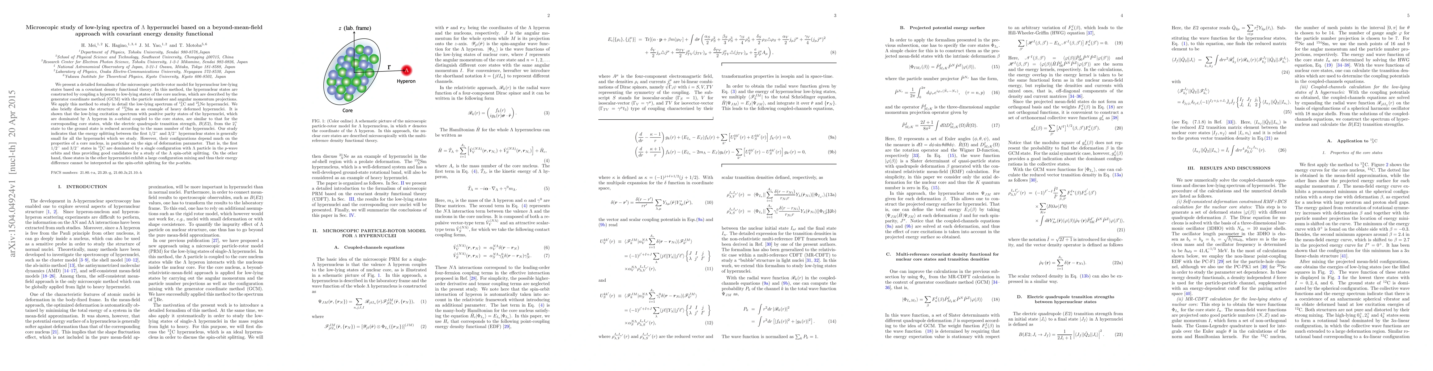 We present a detailed formalism of the microscopic particle-rotor model for hypernuclear low-lying states based on a covariant density functional theory. In this method, the hypernuclear states are constructed by coupling a hyperon to low-lying states of the core nucleus, which are described by the generator coordinate method (GCM) with the particle number and angular momentum projections. We apply this method to study in detail the low-lying spectrum of $^{13}_{~\Lambda}$C and $^{21}_{~\Lambda}$Ne hypernuclei. We also briefly discuss the structure of $^{155}_{~~\Lambda}$Sm as an example of heavy deformed hypernuclei. It is shown that the low-lying excitation spectrum with positive parity states of the hypernuclei, which are dominated by $\Lambda$ hyperon in $s$-orbital coupled to the core states, are similar to that for the corresponding core states, while the electric quadrupole transition strength, $B(E2)$, from the 2$^+_1$ state to the ground state is reduced according to the mass number of the hypernuclei. Our study indicates that the energy splitting between the first 1/2$^-$ and 3/2$^-$ hypernuclear states is generally small for all the hypernuclei which we study. However, their configurations depend much on the properties of a core nucleus, in particular on the sign of deformation parameter. That is, the first $1/2^-$ and $3/2^-$ states in $^{13}_{~\Lambda}$C are dominated by a single configuration with $\Lambda$ particle in the $p$-wave orbits and thus providing good candidates for a study of the $\Lambda$ spin-orbit splitting. On the other hand, those states in the other hypernuclei exhibit a large configuration mixing and thus their energy difference cannot be interpreted as the spin-orbit splitting for the $p$-orbits.