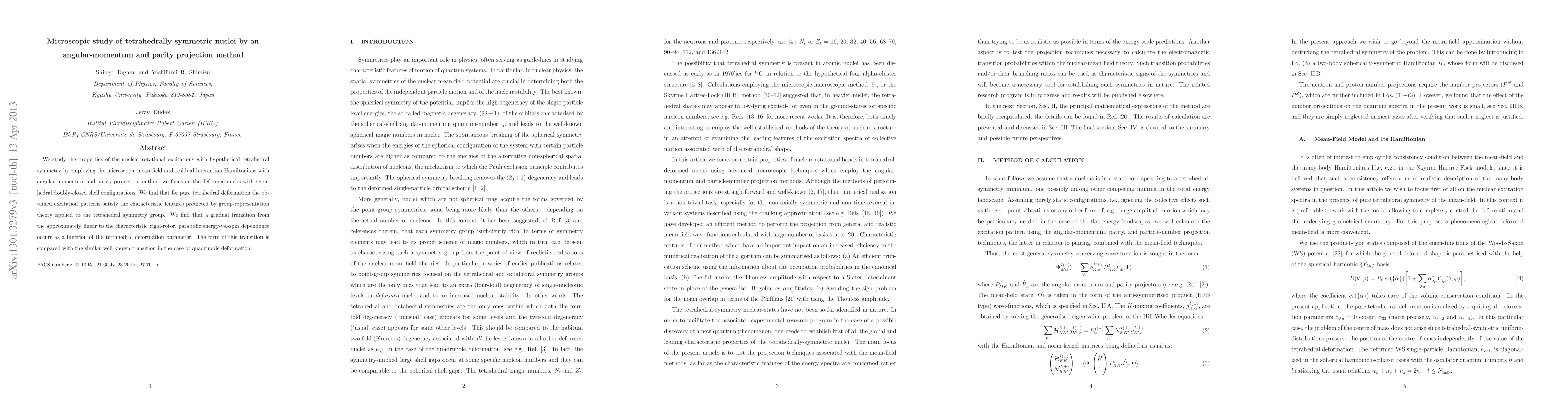 This paper explores nuclear rotational excitations in tetrahedrally symmetric nuclei using a microscopic mean-field and residual-interaction Hamiltonian with angular-momentum and parity projection. It finds that the excitation patterns align with group-theory predictions for tetrahedral symmetry and observes a transition from linear to parabolic energy-vs.-spin behavior as deformation increases.