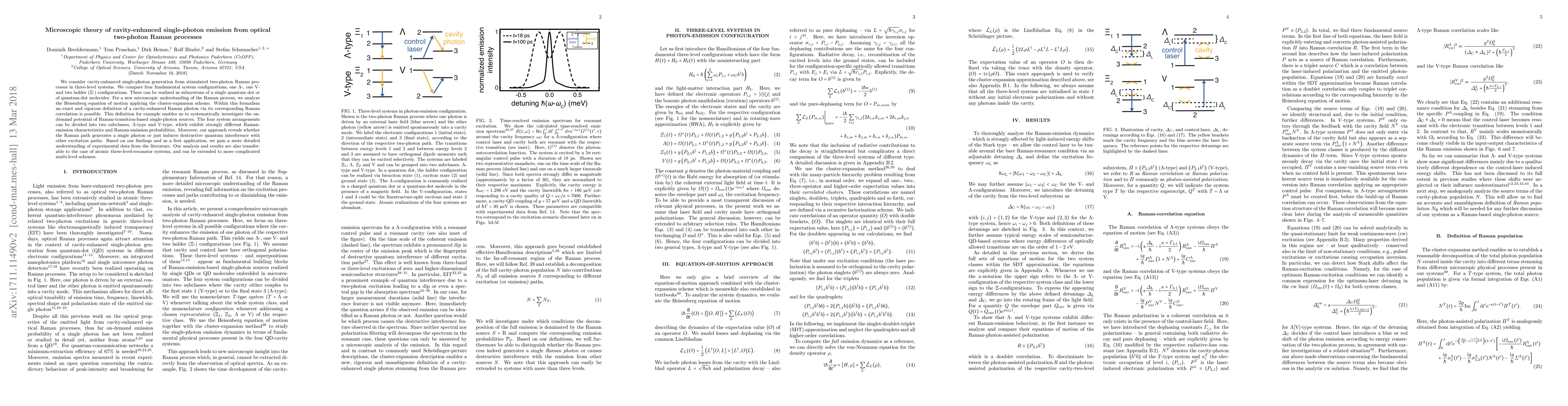 We consider cavity-enhanced single-photon generation from stimulated two-photon Raman processes in three-level systems. We compare four fundamental system configurations, one $\Lambda$-, one V- and two ladder ($\Xi$-) configurations. These can be realized as subsystems of a single quantum dot or of quantum-dot molecules. For a new microscopic understanding of the Raman process, we analyze the Heisenberg equation of motion applying the cluster-expansion scheme. Within this formalism an exact and rigorous definition of a cavity-enhanced Raman photon via its corresponding Raman correlation is possible. This definition for example enables us to systematically investigate the on-demand potential of Raman-transition-based single-photon sources. The four system arrangements can be divided into two subclasses, $\Lambda$-type and V-type, which exhibit strongly different Raman-emission characteristics and Raman-emission probabilities. Moreover, our approach reveals whether the Raman path generates a single photon or just induces destructive quantum interference with other excitation paths. Based on our findings and as a first application, we gain a more detailed understanding of experimental data from the literature. Our analysis and results are also transferable to the case of atomic three-level-resonator systems, and can be extended to more complicated multi-level schemes.