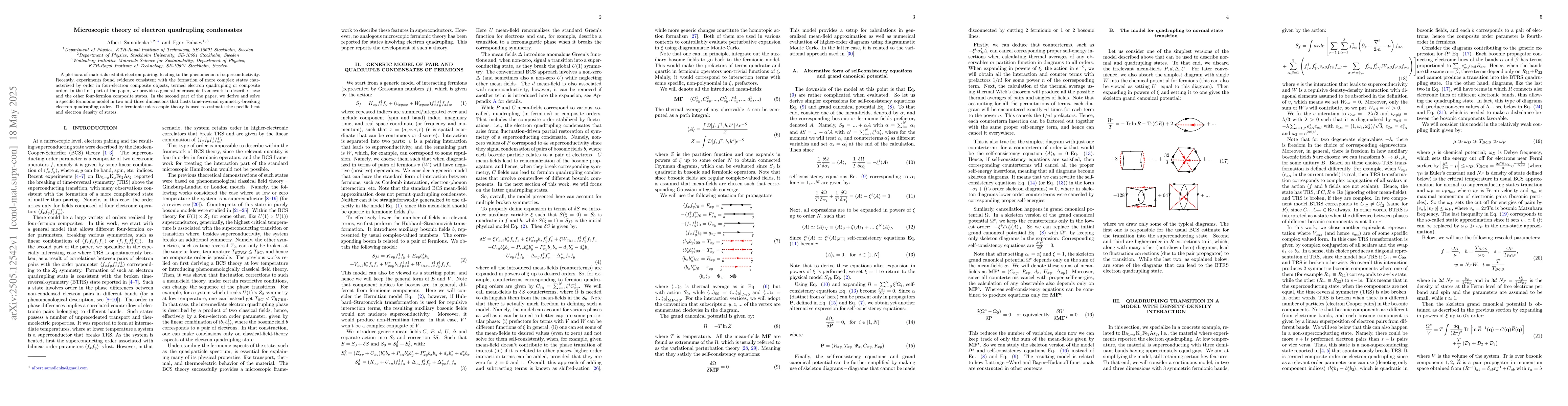 The development of a fermionic model to describe and estimate properties of electron quadrupling condensates in two and three dimensions with time-reversal symmetry-breaking order.