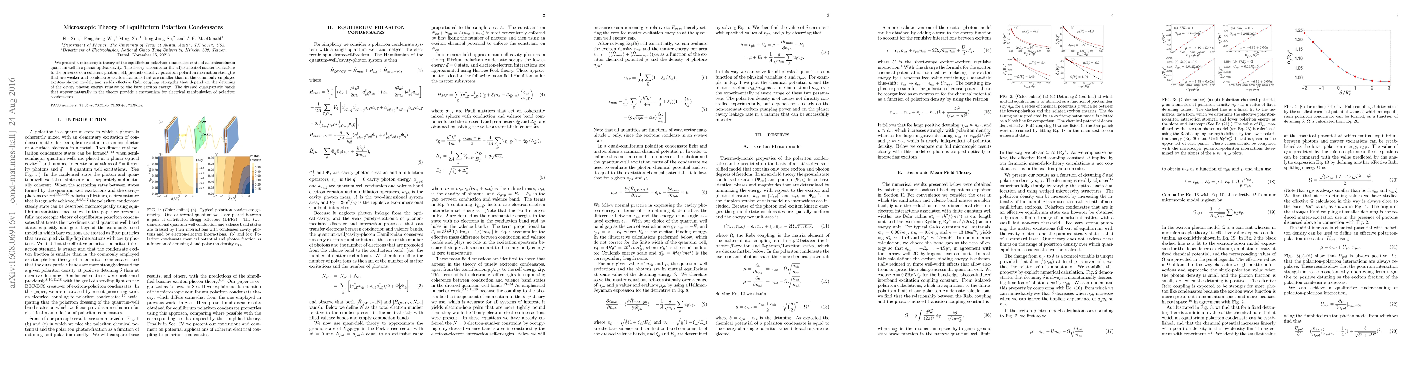This paper develops a microscopic theory for equilibrium polariton condensates in semiconductor quantum wells, showing weaker interactions and smaller exciton fractions than the exciton-photon model, and providing a basis for electrical manipulation via dressed quasiparticle bands.