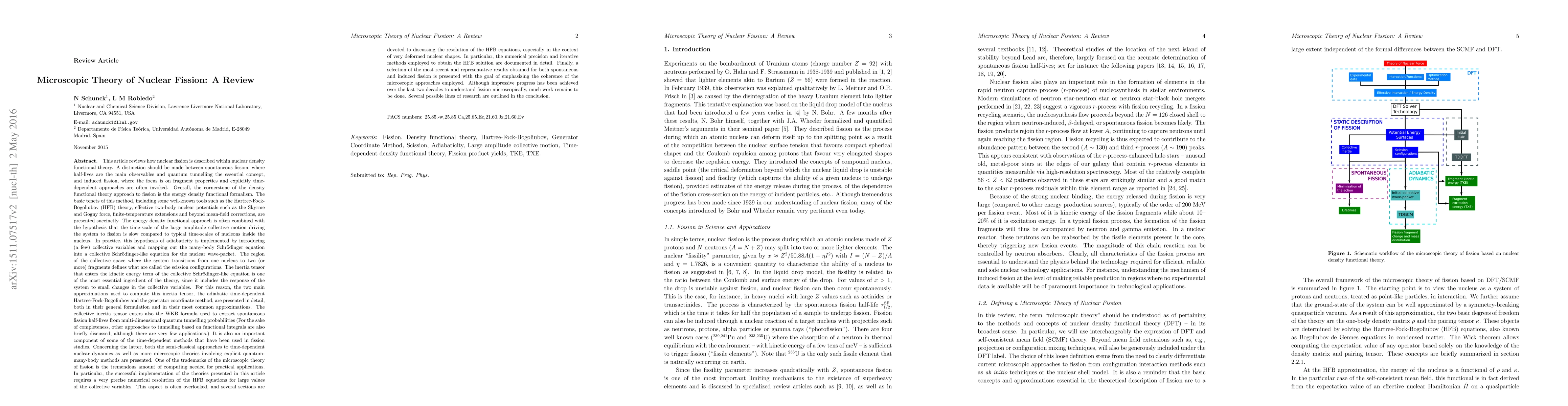 This review outlines the microscopic theory of nuclear fission via nuclear density functional theory, focusing on the energy density functional formalism. It highlights the use of the HFB theory and collective Schrödinger equations to describe spontaneous and induced fission, emphasizing the computational complexity involved and recent results supporting the coherence of these approaches.