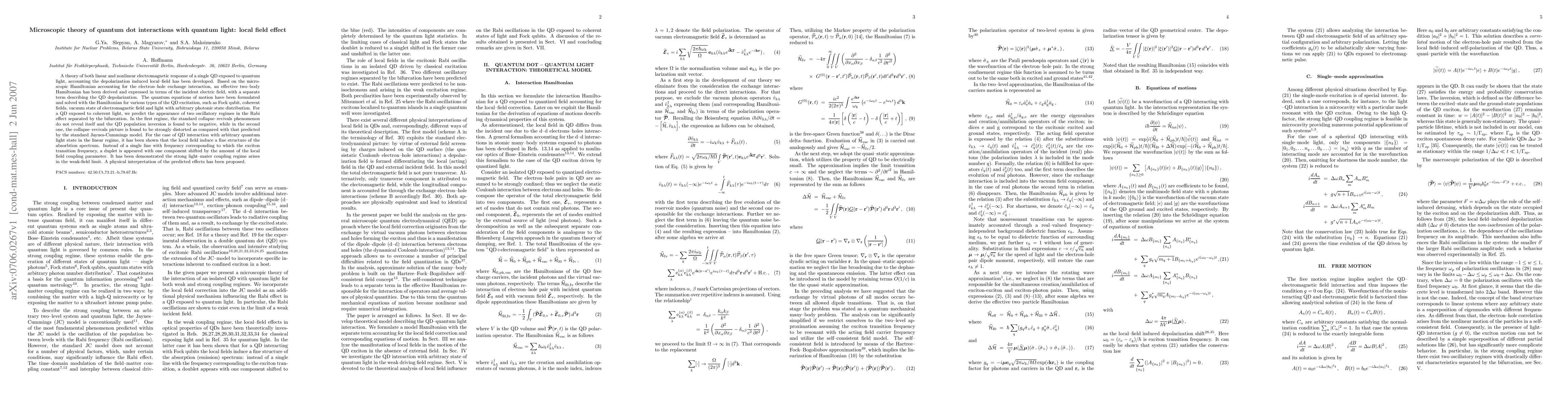 A theory of both linear and nonlinear electromagnetic response of a single QD exposed to quantum light, accounting the depolarization induced local--field has been developed. Based on the microscopic Hamiltonian accounting for the electron--hole exchange interaction, an effective two--body Hamiltonian has been derived and expressed in terms of the incident electric field, with a separate term describing the QD depolarization. The quantum equations of motion have been formulated and solved with the Hamiltonian for various types of the QD excitation, such as Fock qubit, coherent fields, vacuum state of electromagnetic field and light with arbitrary photonic state distribution. For a QD exposed to coherent light, we predict the appearance of two oscillatory regimes in the Rabi effect separated by the bifurcation. In the first regime, the standard collapse--revivals phenomenon do not reveal itself and the QD population inversion is found to be negative, while in the second one, the collapse--revivals picture is found to be strongly distorted as compared with that predicted by the standard Jaynes-Cummings model. %The model developed can easily be extended to %%electromagnetic excitation. For the case of QD interaction with arbitrary quantum light state in the linear regime, it has been shown that the local field induce a fine structure of the absorbtion spectrum. Instead of a single line with frequency corresponding to which the exciton transition frequency, a duplet is appeared with one component shifted by the amount of the local field coupling parameter. It has been demonstrated the strong light--mater coupling regime arises in the weak-field limit. A physical interpretation of the predicted effects has been proposed.
