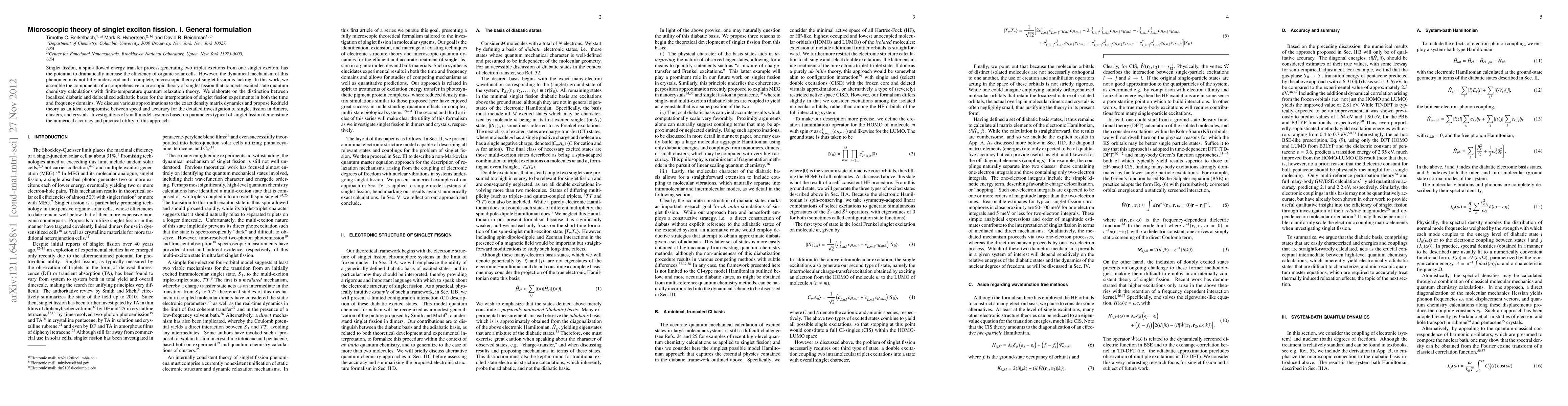This paper develops a comprehensive microscopic theory for singlet fission, connecting quantum chemistry with quantum relaxation theory, and proposes Redfield theory as a balanced approach for studying exciton dynamics in organic solar cells. The work also distinguishes between localized and delocalized bases for interpreting fission experiments.