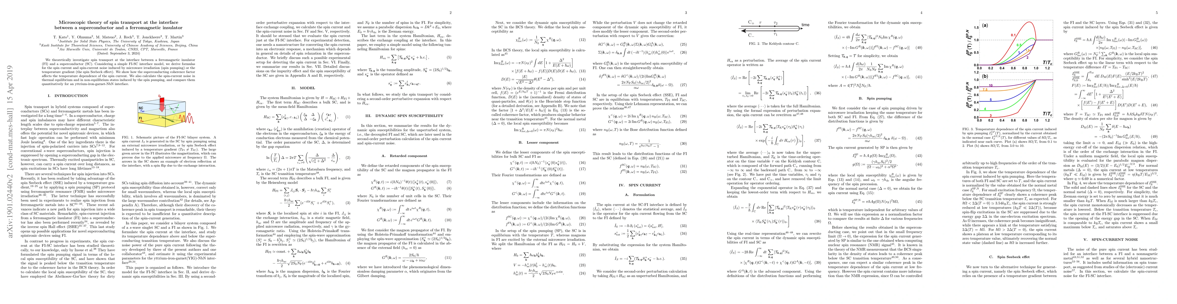 This paper theoretically explores spin transport at the interface between a ferromagnetic insulator and a superconductor, deriving formulas for spin current and noise induced by microwave irradiation or temperature gradients. It examines the impact of superconducting coherence on spin current temperature dependence and compares spin-current noise in thermal and non-equilibrium states for a yttrium-iron-garnet-NbN interface.