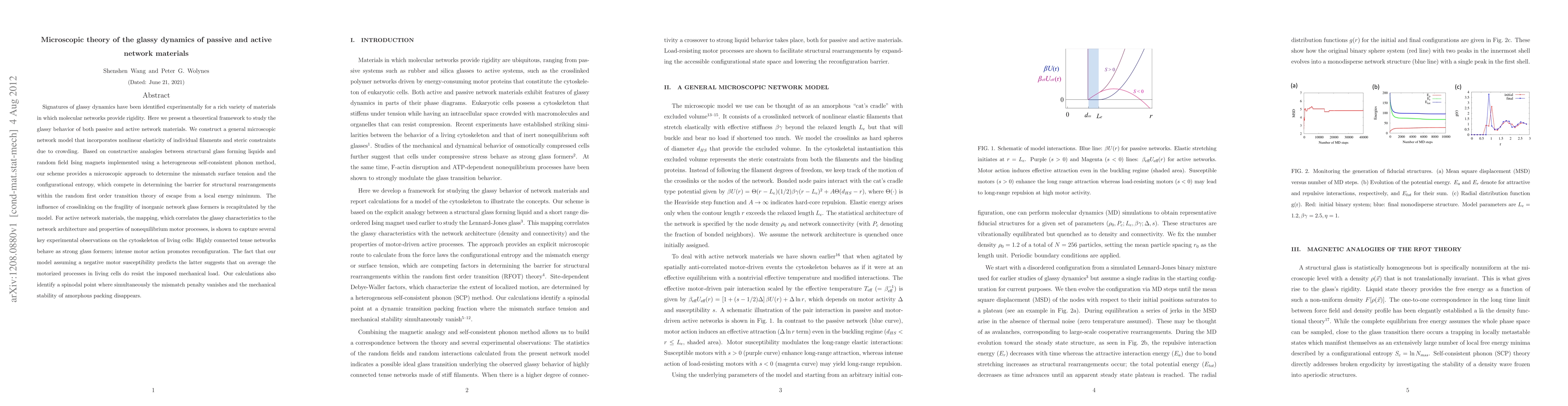 Signatures of glassy dynamics have been identified experimentally for a rich variety of materials in which molecular networks provide rigidity. Here we present a theoretical framework to study the glassy behavior of both passive and active network materials. We construct a general microscopic network model that incorporates nonlinear elasticity of individual filaments and steric constraints due to crowding. Based on constructive analogies between structural glass forming liquids and random field Ising magnets implemented using a heterogeneous self-consistent phonon method, our scheme provides a microscopic approach to determine the mismatch surface tension and the configurational entropy, which compete in determining the barrier for structural rearrangements within the random first order transition theory of escape from a local energy minimum. The influence of crosslinking on the fragility of inorganic network glass formers is recapitulated by the model. For active network materials, the mapping, which correlates the glassy characteristics to the network architecture and properties of nonequilibrium motor processes, is shown to capture several key experimental observations on the cytoskeleton of living cells: Highly connected tense networks behave as strong glass formers; intense motor action promotes reconfiguration. The fact that our model assuming a negative motor susceptibility predicts the latter suggests that on average the motorized processes in living cells do resist the imposed mechanical load. Our calculations also identify a spinodal point where simultaneously the mismatch penalty vanishes and the mechanical stability of amorphous packing disappears.