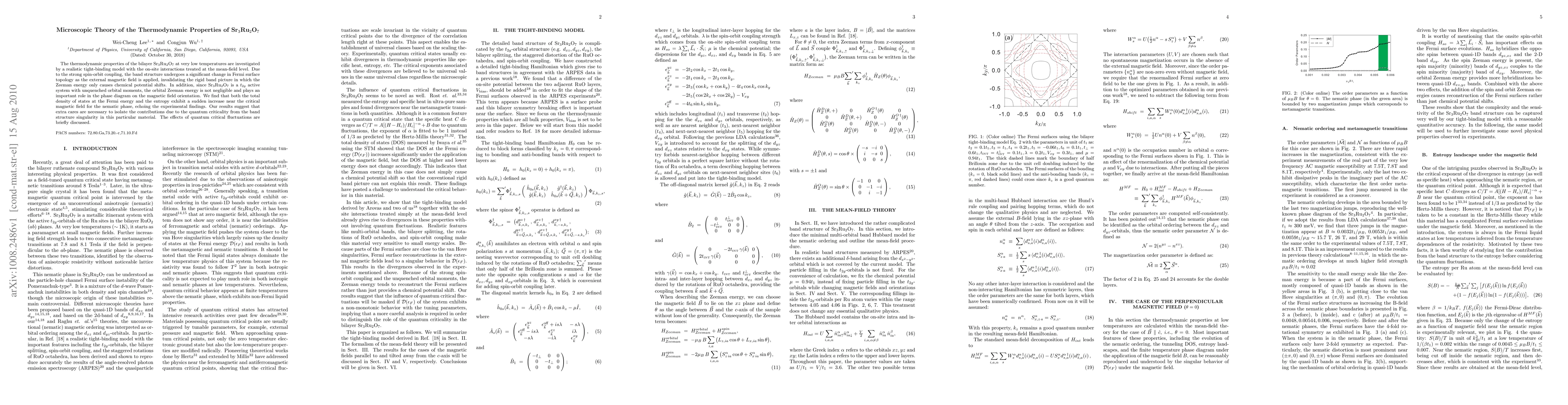 This study uses a tight-binding model to analyze Sr$_3$Ru$_2$O$_7$'s thermodynamic properties at low temperatures, revealing significant changes in Fermi surface topology due to strong spin-orbit coupling under magnetic fields. The research highlights the importance of orbital Zeeman energy in the material's phase diagram and finds a sudden increase in density of states and entropy near the critical magnetic field for the nematic phase.