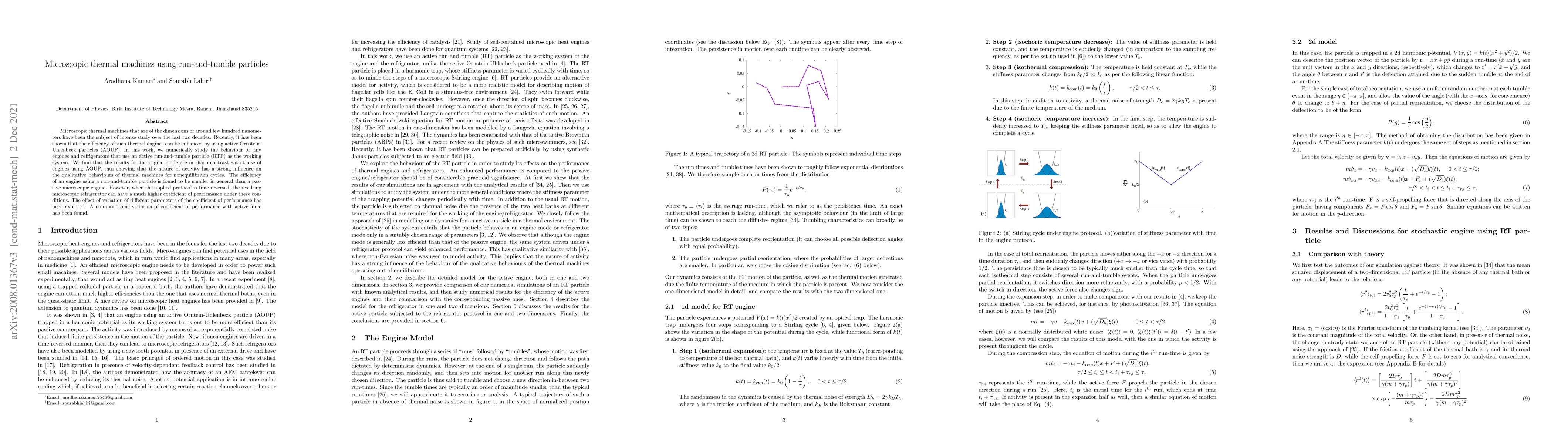 This paper investigates microscopic thermal machines utilizing active run-and-tumble particles (RTP) and finds that their efficiency differs significantly from engines using active Ornstein-Uhlenbeck particles (AOUP). While RTP engines are generally less efficient, RTP refrigerators exhibit higher performance when the protocol is reversed.