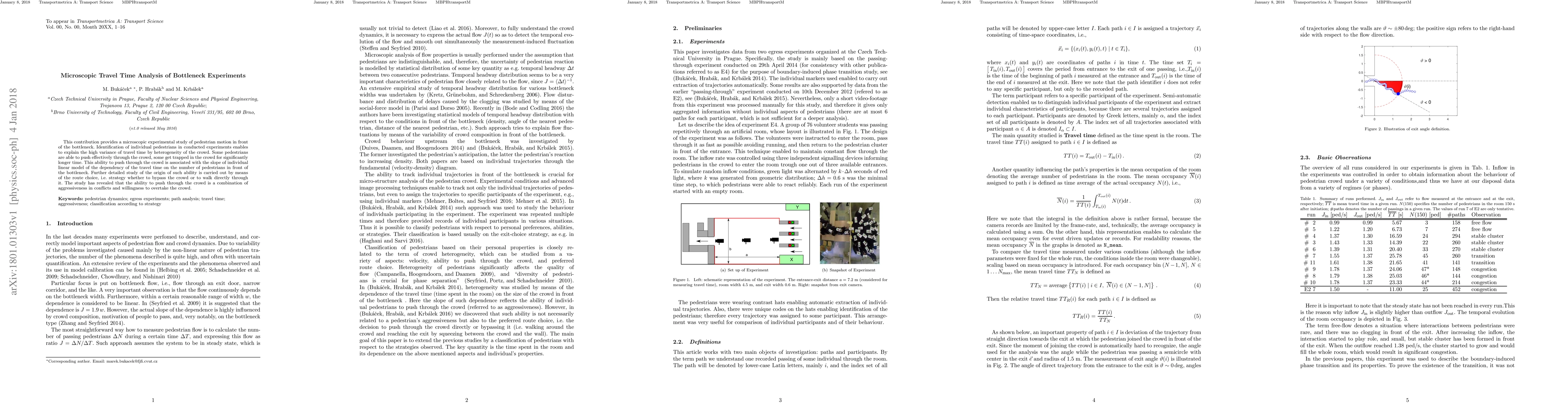 This contribution provides a microscopic experimental study of pedestrian motion in front of the bottleneck. Identification of individual pedestrians in conducted experiments enables to explain the high variance of travel time by heterogeneity of the crowd. Some pedestrians are able to push effectively through the crowd, some get trapped in the crowd for significantly longer time. This ability to push through the crowd is associated with the slope of individual linear model of the dependency of the travel time on the number of pedestrians in front of the bottleneck. Further detailed study of the origin of such ability is carried out by means of the route choice, i.e. strategy whether to bypass the crowd or to walk directly through it. The study has revealed that the ability to push through the crowd is a combination of aggressiveness in conflicts and willingness to overtake the crowd.