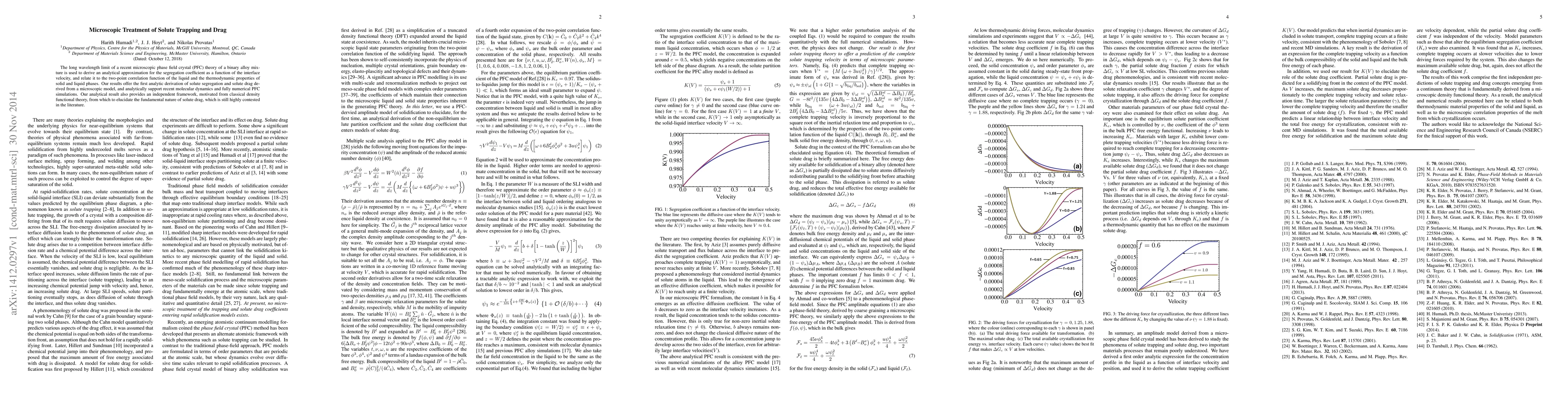 The long wavelength limit of a recent microscopic phase field crystal (PFC) theory of a binary alloy mix- ture is used to derive an analytical approximation for the segregation coefficient as a function of the interface velocity, and relate it to the two-point correlation function of the liquid and the thermodynamic properties of solid and liquid phases. Our results offer the first analytic derivation of solute segregation and solute drag de- rived from a microscopic model, and analytically support recent molecular dynamics and fully numerical PFC simulations. Our analytical result also provides an independent framework, motivated from classical density functional theory, from which to elucidate the fundamental nature of solute drag, which is still highly contested in the literature.