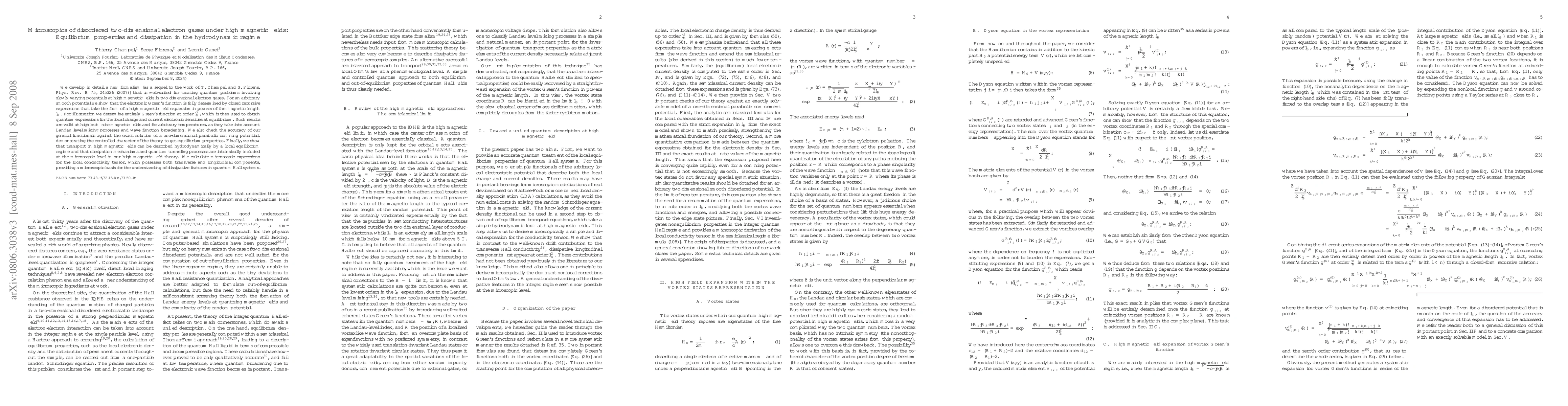 This paper develops a new formalism for treating quantum problems in disordered two-dimensional electron gases under high magnetic fields, determining electronic Green's functions and local charge and current densities. It also establishes a hydrodynamic description of transport, including dissipation mechanisms and quantum tunneling, providing microscopic expressions for the local conductivity tensor.