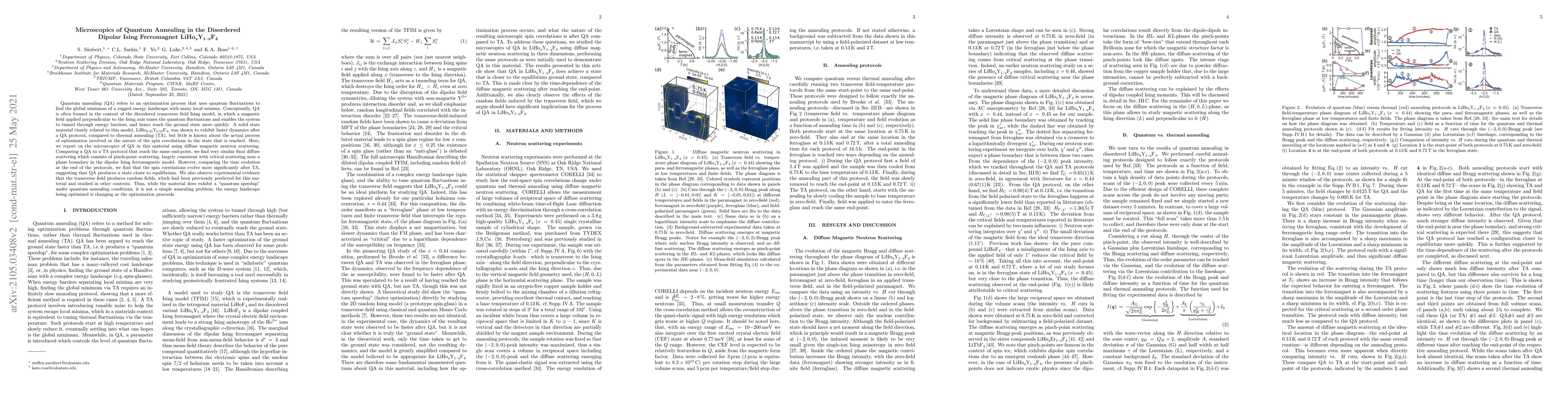 Quantum annealing (QA) refers to an optimization process that uses quantum fluctuations to find the global minimum of a rugged energy landscape with many local minima. Conceptually, QA is often framed in the context of the disordered transverse field Ising model, in which a magnetic field applied perpendicular to the Ising axis tunes the quantum fluctuations and enables the system to tunnel through energy barriers, and hence reach the ground state more quickly. A solid state material closely related to this model, LiHo$_{0.45}$Y$_{0.55}$F$_4$, was shown to exhibit faster dynamics after a QA protocol, compared to thermal annealing (TA), but little is known about the actual process of optimization involved or the nature of the spin correlations in the state that is reached. Here, we report on the microscopics of QA in this material using diffuse magnetic neutron scattering. Comparing a QA to a TA protocol that reach the same end-point, we find very similar final diffuse scattering which consists of pinch-point scattering, largely consistent with critical scattering near a phase boundary in the dipolar Ising ferromagnetic model. However, comparing the time evolution at the end of the protocols, we find that the spin correlations evolve more significantly after TA, suggesting that QA produces a state closer to equilibrium. We also observe experimental evidence that the transverse field produces random fields, which had been previously predicted for this material and studied in other contexts. Thus, while the material does exhibit a quantum speedup under quantum annealing conditions, it is not a simple annealing problem; the energy landscape being optimized is changing as the optimization proceeds.