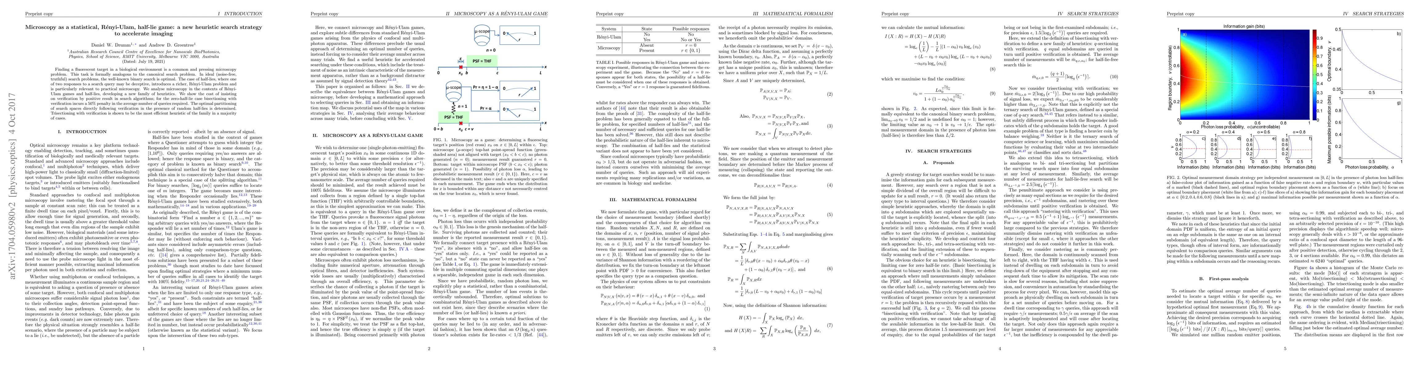 Finding a fluorescent target in a biological environment is a common and pressing microscopy problem. This task is formally analogous to the canonical search problem. In ideal (noise-free, truthful) search problems, the well-known binary search is optimal. The case of half-lies, where one of two responses to a search query may be deceptive, introduces a richer, R\'enyi-Ulam problem and is particularly relevant to practical microscopy. We analyse microscopy in the contexts of R\'enyi-Ulam games and half-lies, developing a new family of heuristics. We show the cost of insisting on verification by positive result in search algorithms; for the zero-half-lie case bisectioning with verification incurs a 50% penalty in the average number of queries required. The optimal partitioning of search spaces directly following verification in the presence of random half-lies is determined. Trisectioning with verification is shown to be the most efficient heuristic of the family in a majority of cases.
