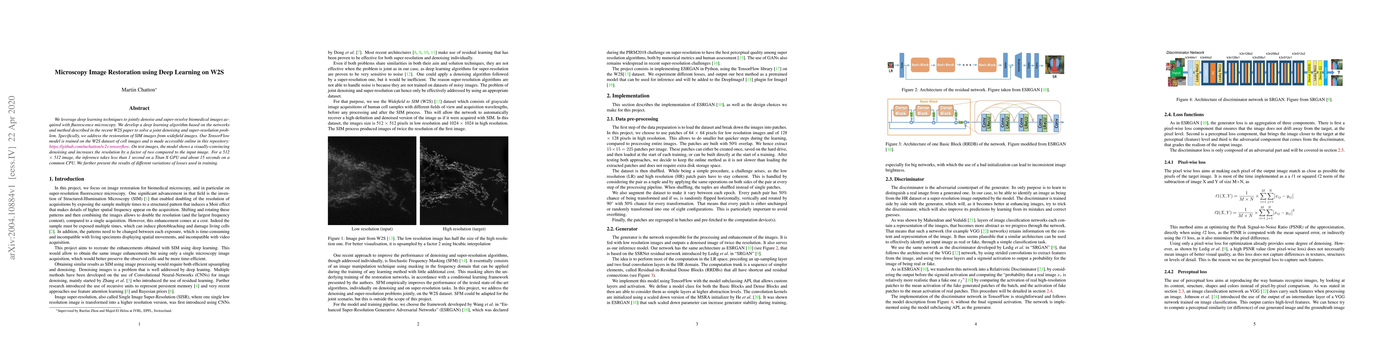 We leverage deep learning techniques to jointly denoise and super-resolve biomedical images acquired with fluorescence microscopy. We develop a deep learning algorithm based on the networks and method described in the recent W2S paper to solve a joint denoising and super-resolution problem. Specifically, we address the restoration of SIM images from widefield images. Our TensorFlow model is trained on the W2S dataset of cell images and is made accessible online in this repository: https://github.com/mchatton/w2s-tensorflow. On test images, the model shows a visually-convincing denoising and increases the resolution by a factor of two compared to the input image. For a 512 $\times$ 512 image, the inference takes less than 1 second on a Titan X GPU and about 15 seconds on a common CPU. We further present the results of different variations of losses used in training.