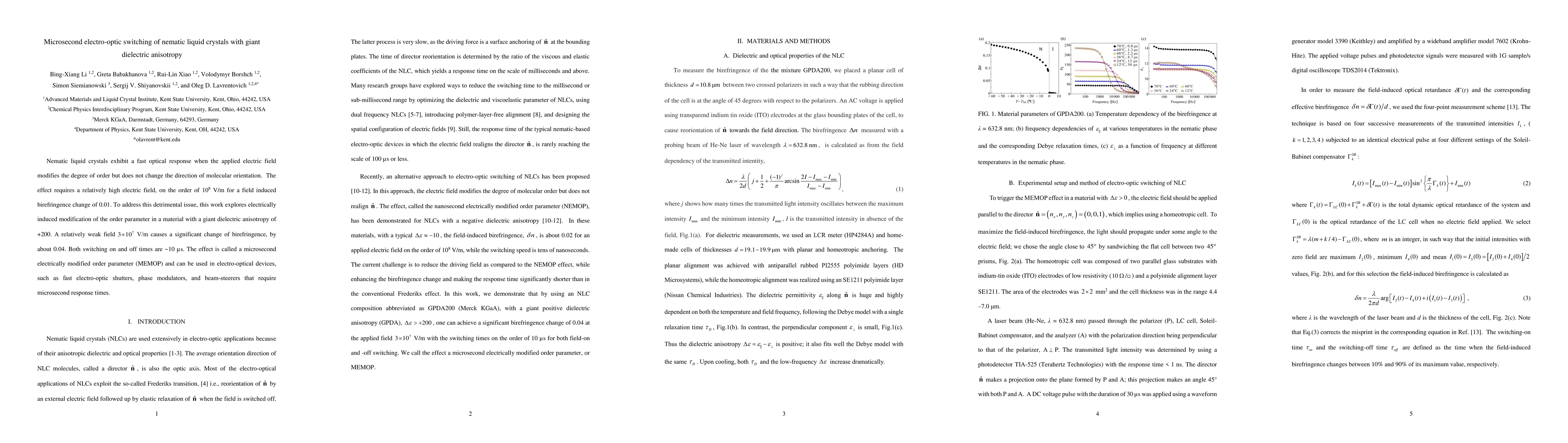 This paper investigates the microsecond electro-optic switching of nematic liquid crystals with giant dielectric anisotropy, achieving significant birefringence changes with a relatively low electric field of 3X10^7 V/m. The MEMOP effect enables fast switching on and off times of ~10 microseconds, suitable for high-speed electro-optical devices.