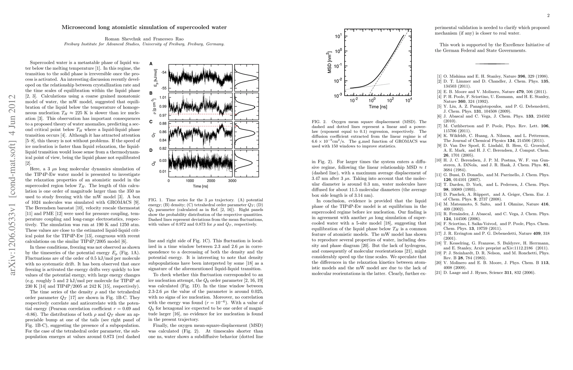 This paper presents a 3 μs long atomistic molecular dynamics simulation of supercooled water using the TIP4P-Ew model, demonstrating that the liquid phase remains at equilibrium in the supercooled region below the temperature of homogeneous nucleation, challenging the notion that equilibration is slower than ice nucleation. The findings support the idea that the liquid phase can maintain equilibrium before ice formation.