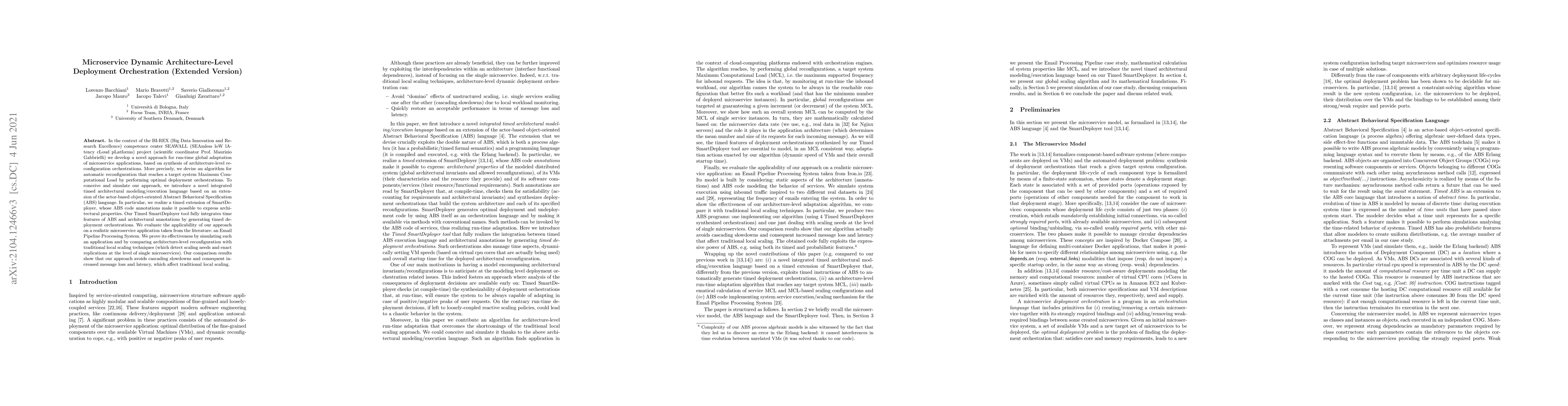 In the context of the BI-REX (Big Data Innovation and Research Excellence) competence center SEAWALL (SEAmless loW lAtency cLoud pLatforms) project (scientific coordinator Prof. Maurizio Gabbrielli) we develop a novel approach for run-time global adaptation of microservice applications, based on synthesis of architecture-level reconfiguration orchestrations. More precisely, we devise an algorithm for automatic reconfiguration that reaches a target system Maximum Computational Load by performing optimal deployment orchestrations. To conceive and simulate our approach, we introduce a novel integrated timed architectural modeling/execution language based on an extension of the actor-based object-oriented Abstract Behavioral Specification (ABS) language. In particular, we realize a timed extension of SmartDeployer, whose ABS code annotations make it possible to express architectural properties. Our Timed SmartDeployer tool fully integrates time features of ABS and architectural annotations by generating timed deployment orchestrations. We evaluate the applicability of our approach on a realistic microservice application taken from the literature: an Email Pipeline Processing System. We prove its effectiveness by simulating such an application and by comparing architecture-level reconfiguration with traditional local scaling techniques (which detect scaling needs and enact replications at the level of single microservices). Our comparison results show that our approach avoids cascading slowdowns and consequent increased message loss and latency, which affect traditional local scaling.