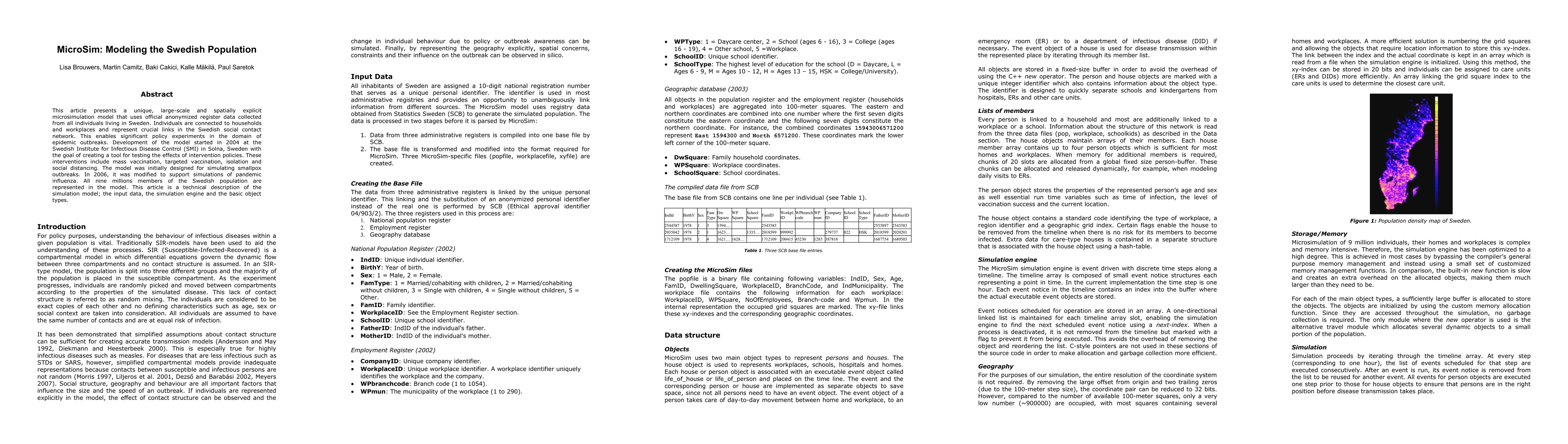 This paper introduces MicroSim, a comprehensive microsimulation model of the Swedish population using official anonymized data, designed to simulate social contact networks and test intervention policies for epidemic outbreaks, initially developed for smallpox and later adapted for pandemic influenza. The model represents all nine million individuals in Sweden, detailing its input data, simulation engine, and object types.