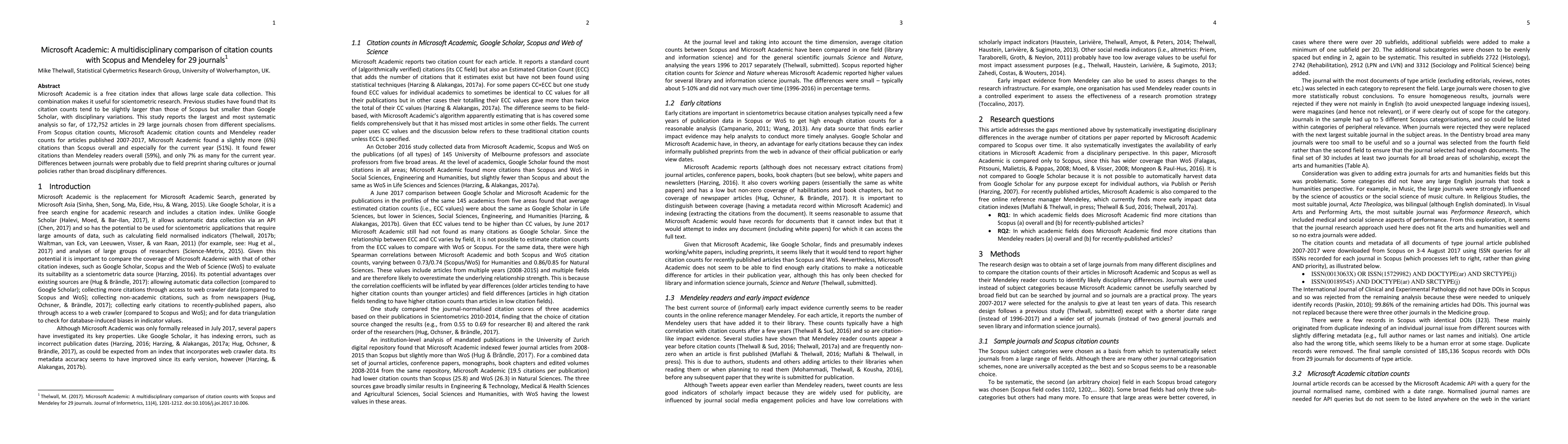 Microsoft Academic provides slightly more citations than Scopus but fewer than Mendeley, with notable variations among 29 multidisciplinary journals. The differences likely stem from field-specific preprint sharing and journal policies rather than broad disciplinary trends.
