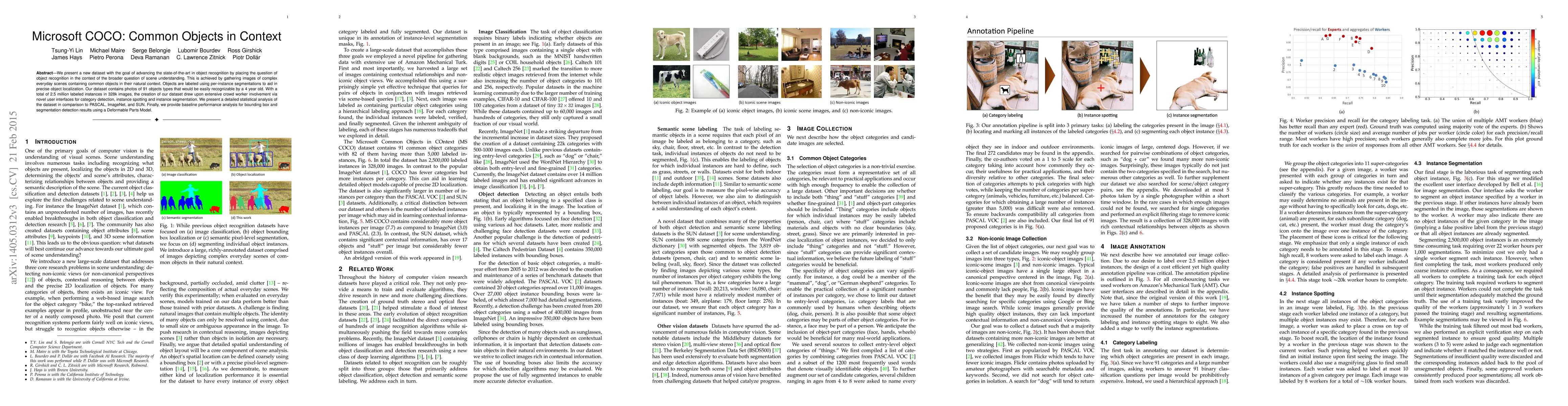 Researchers created a large dataset, Microsoft COCO, to improve object recognition by placing objects in everyday scenes, with over 2.5 million labeled instances from 328k images.