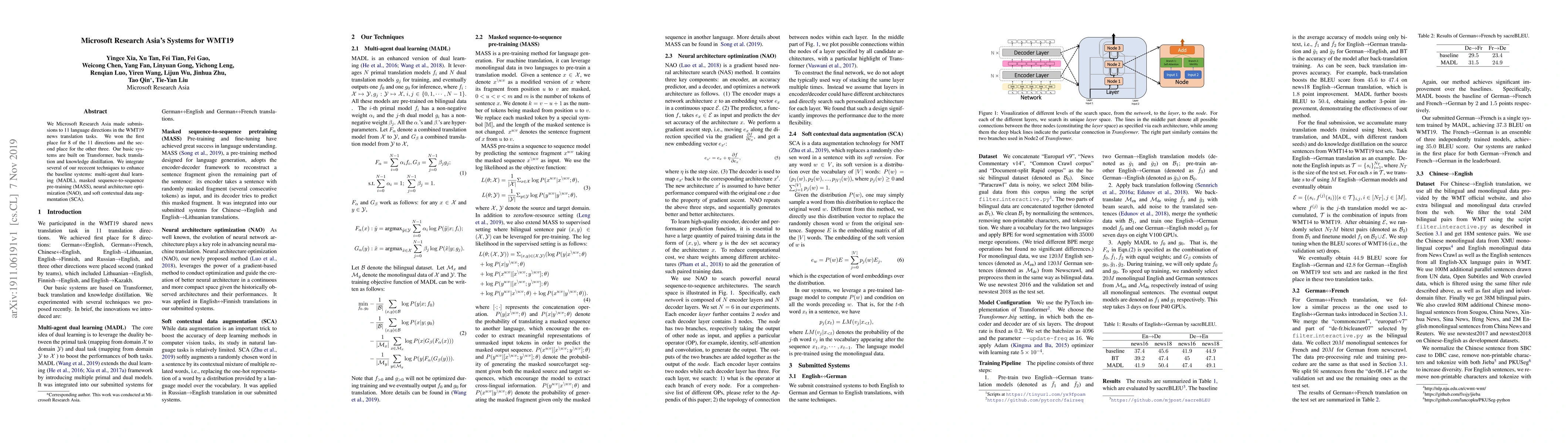 We Microsoft Research Asia made submissions to 11 language directions in the WMT19 news translation tasks. We won the first place for 8 of the 11 directions and the second place for the other three. Our basic systems are built on Transformer, back translation and knowledge distillation. We integrate several of our rececent techniques to enhance the baseline systems: multi-agent dual learning (MADL), masked sequence-to-sequence pre-training (MASS), neural architecture optimization (NAO), and soft contextual data augmentation (SCA).
